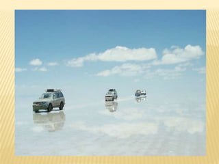 Η λίμνη αυτήμε την ονομασία SalardeUyuni που βρίσκεται στα υψίπεδα της νοτιοδυτικής Βολιβίας, στην Νότια Αμερική είναι η μεγαλύτερη αλατο-λίμνη του κόσμου και βρίσκεται σε ύψος 3.656 μέτρων από την επιφάνεια της θάλασσας!Οι αντικατοπτρισμοί που προσφέρει είναι μαγευτικοί και το τοπίο μοιάζει να είναι Αρειανό - μάλιστα όταν βρέξει και υπάρχει νερό στην λίμνη, αποτελεί τον μεγαλύτερο καθρέφτη του πλανήτη μας. Περιτριγυρισμένη από βουνά με κάκτους, ηφαίστεια και geysers είναι ένα πολύ αλλόκοτο τοπίο που δικαίως βρίσκεται πολύ ψηλά στον κατάλογο με τα πιο παράξενα μέρη της γης!
