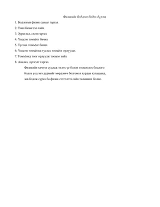 Физикийн бодлого бодох дүрэм 1. Бодлогын физик санааг гаргах 2. Товч бичиглэл хийх 3. Зураглал, схем гаргах 4. Үндсэн томъёог бичих 5. Туслах томъёог бичих 6. Үндсэн томъёонд туслах томъёог орлуулах 7. Томъёонд тоог орлуулж тооцоо хийх 8. Анализ, дүгнэлт гаргах