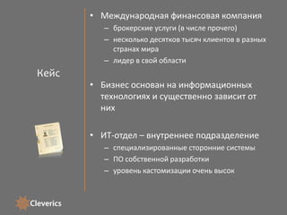 Документ содержит описание процесса поиска IT-директора для компании Cleverics, включая требования к кандидатам и их квалификации. Упоминаются амбициозные планы компании, такие как увеличение клиентской базы и запуск новых услуг. Также содержатся советы по составлению резюме и подготовке к интервью для соискателей.