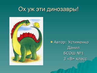 Документ описывает жизнь и внешний вид динозавров, вымерших около 65 миллионов лет назад, с акцентом на различные их виды, такие как стегозавр, тираннозавр и трицератопс. Автор, ученик третьего класса, воссоздает динозавров из пластилина и акцентирует внимание на их уникальных физических характеристиках и поведенческих особенностях. Также представляется список литературы, использованной для написания работы о динозаврах.