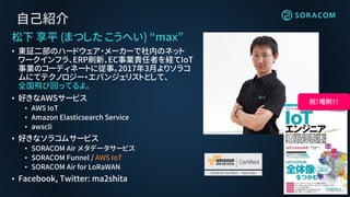 こうへい) “max” • 東証二部のハードウェア・メーカーで社内のネット ワークインフラ、ERP刷新、EC事業責任者を経てIoT 事業のコーディネートに従事。2017年3月よりソラコ ムにてテクノロジー・エバンジェリストとして、 全国飛び回ってるよ。 • 好きなAWSサービス • AWS IoT • Amazon Elasticsearch Service • awscli • 好きなソラコムサービス • SORACOM Air メタデータサービス • SORACOM Funnel / AWS IoT • SORACOM Air for LoRaWAN • Facebook, Twitter: ma2shita 祝!増刷!!