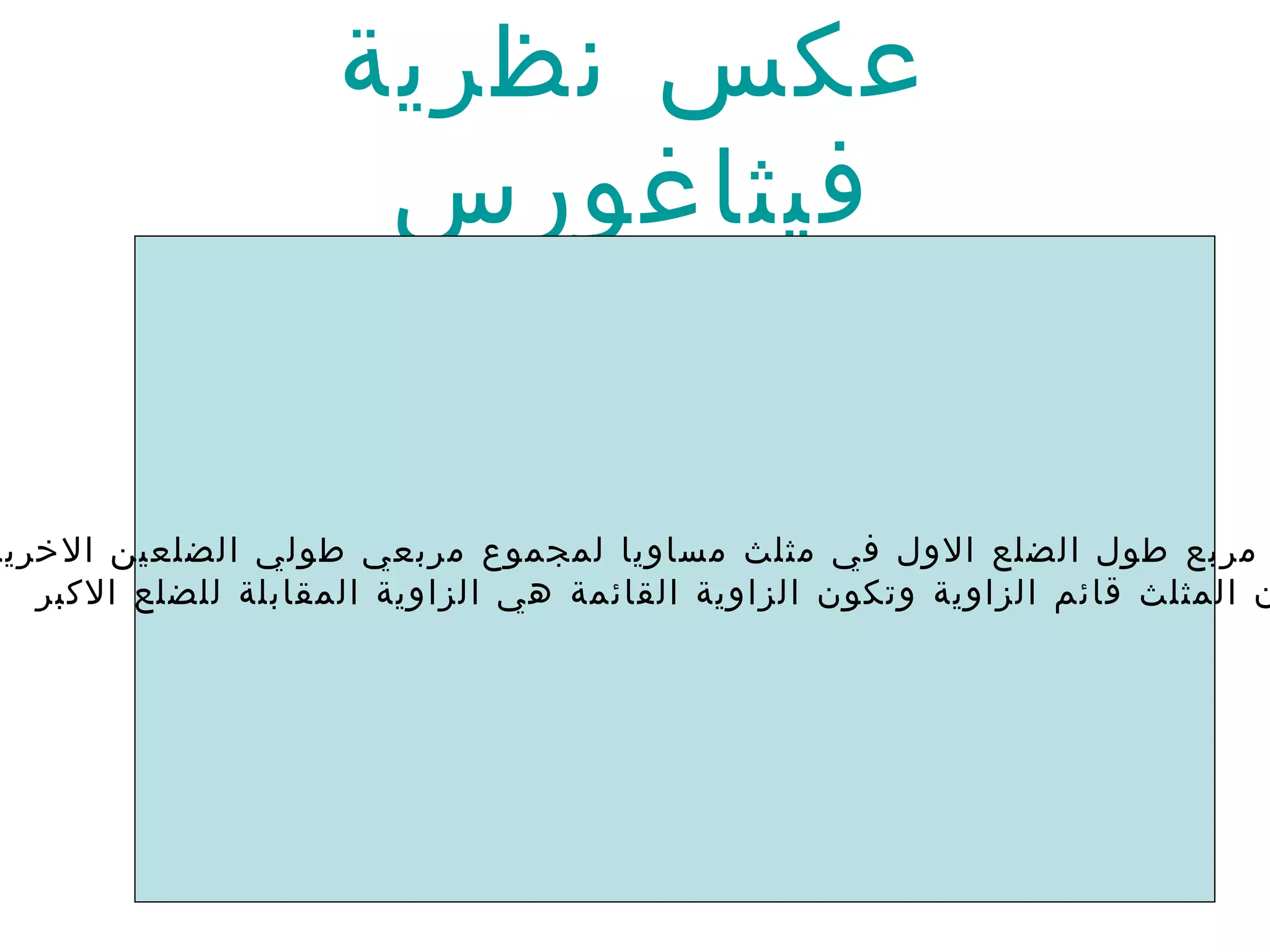 عكس نظرية فيثاغورساذا كان مربع طول الضلع الاول في مثلث مساويا لمجموع مربعي طولي الضلعين الاخرين فان المثلث قائم الزاوية وتكون الزاوية القائمة هي الزاوية المقابلة للضلع الاكبر