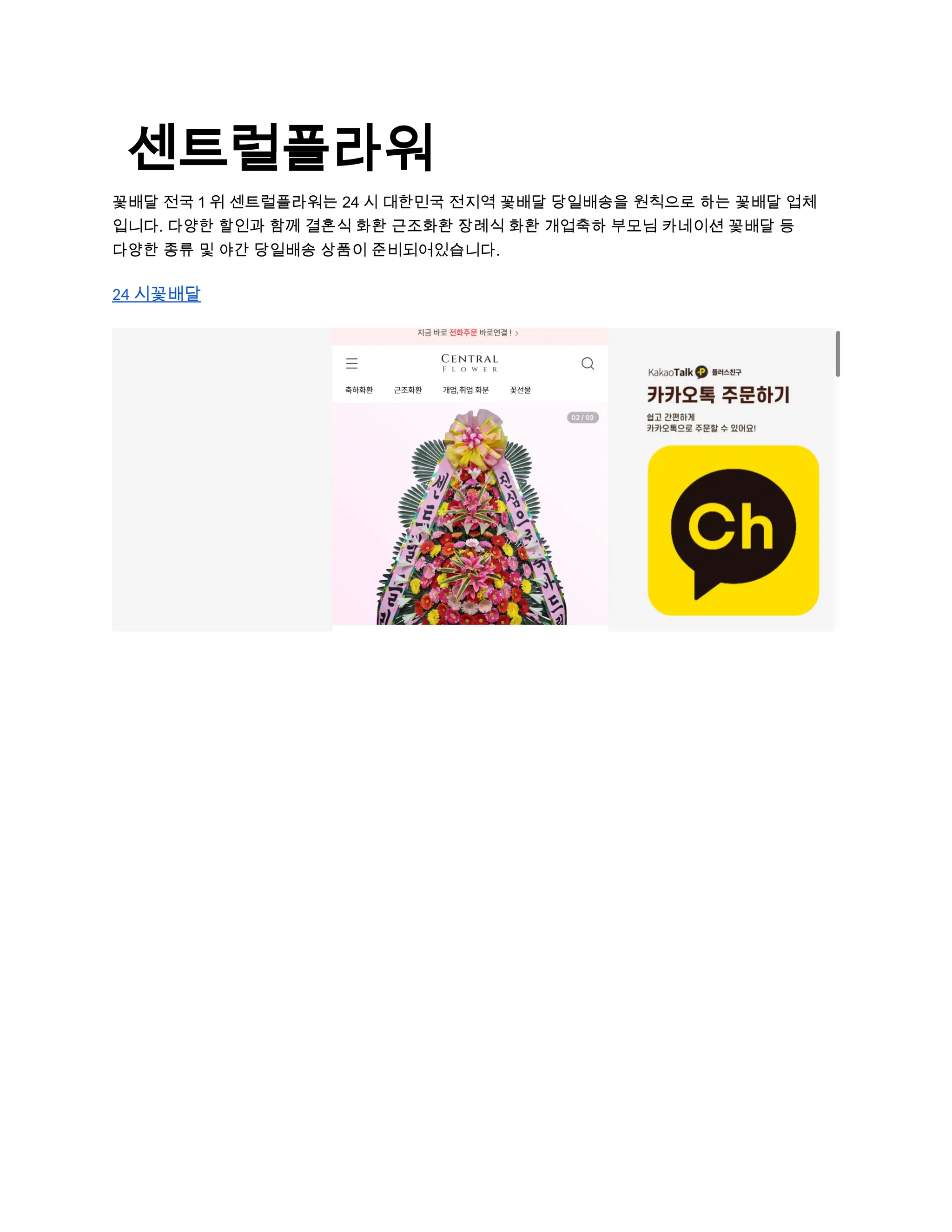 꽃배달 전국1위 센트럴플라워는 24시 대한민국 전지역 꽃배달 당일배송을 원칙으로 하는 꽃배달 업체 입니다. 다양한 할인과 함께 결혼식 화환 근조화환 장례식 화환 개업축하 부모님 카네이션 꽃배달 등 다양한 종류 및 야간 당일배송 상품이 준비되어있습니다.