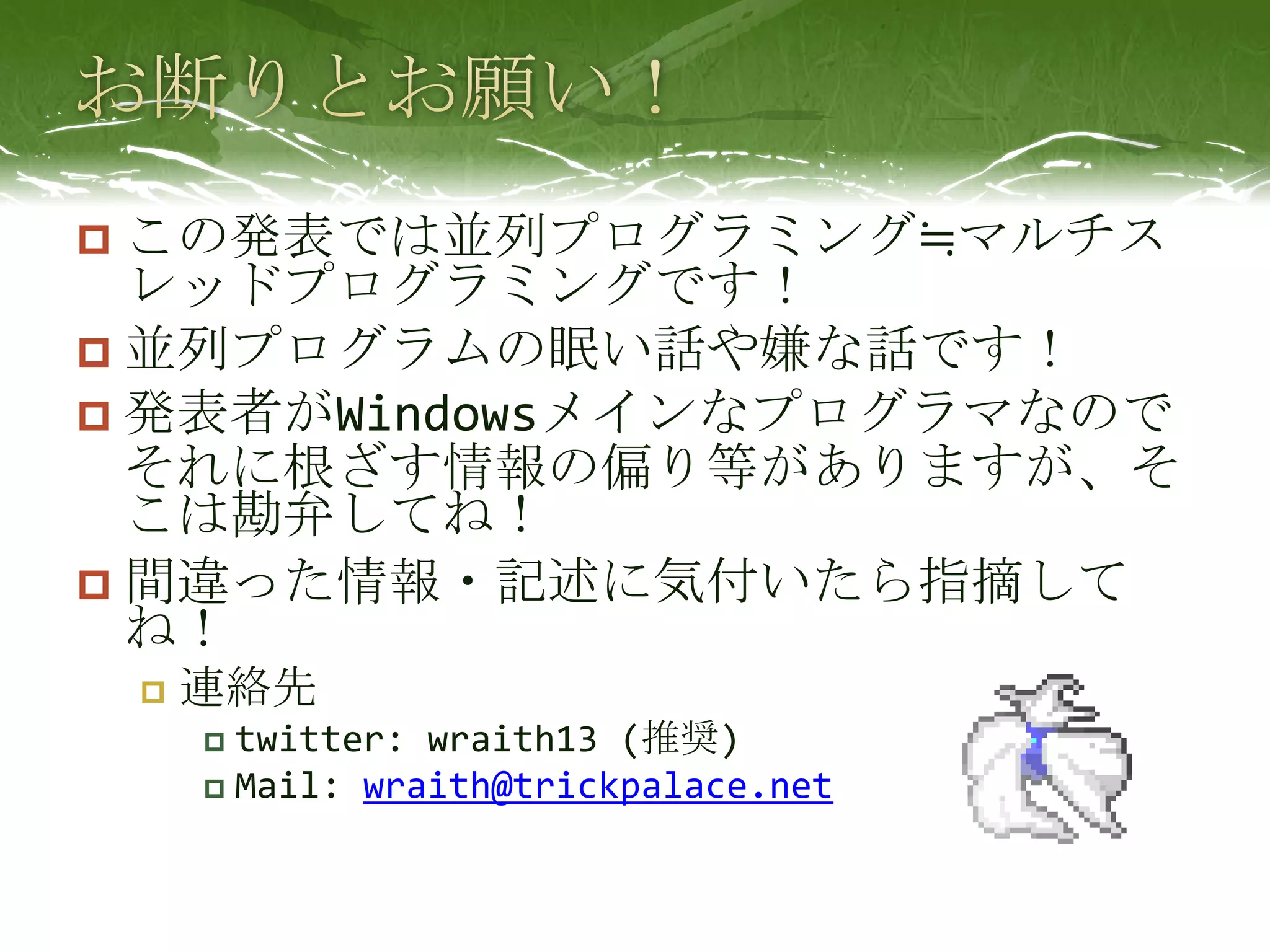 お断りとお願い!この発表では並列プログラミング≒マルチスレッドプログラミングです!並列プログラムの眠い話や嫌な話です!発表者がWindowsメインなプログラマなのでそれに根ざす情報の偏り等がありますが、そこは勘弁してね!間違った情報・記述に気付いたら指摘してね!連絡先twitter: wraith13 (推奨)Mail: