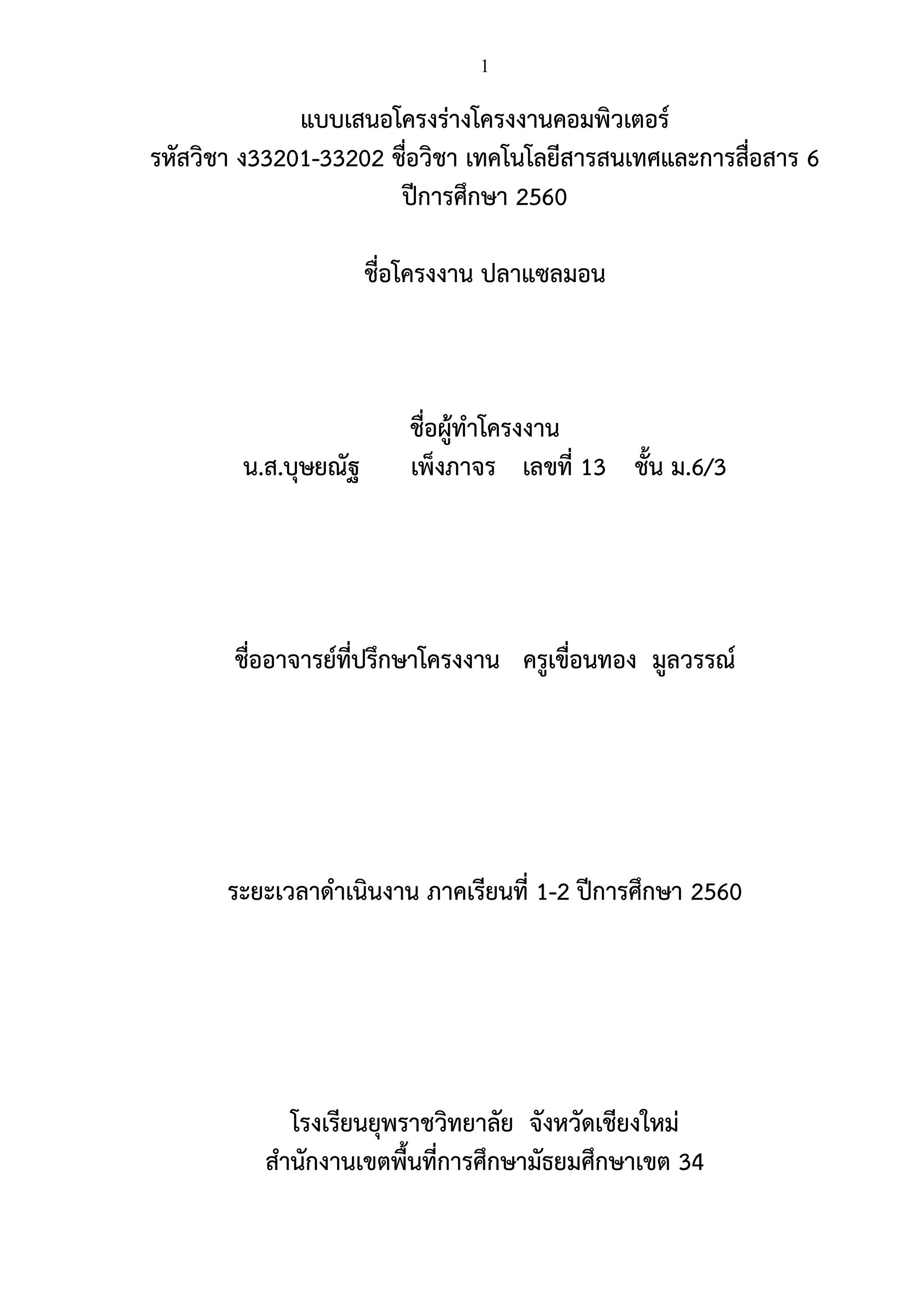 เทคโนโลยีสารสนเทศและการสื่อสาร 6 ปีการศึกษา 2560 ชื่อโครงงาน ปลาแซลมอน ชื่อผู้ทาโครงงาน น.ส.บุษยณัฐ เพ็งภาจร เลขที่ 13 ชั้น ม.6/3 ชื่ออาจารย์ที่ปรึกษาโครงงาน ครูเขื่อนทอง มูลวรรณ์ ระยะเวลาดาเนินงาน ภาคเรียนที่ 1-2 ปีการศึกษา 2560 โรงเรียนยุพราชวิทยาลัย จังหวัดเชียงใหม่ สานักงานเขตพื้นที่การศึกษามัธยมศึกษาเขต 34