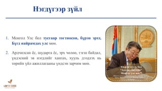 Ардчилсан ёс, шударга ёс, эрх чөлөө, тэгш байдал, үндэсний эв нэгдлийг хангах, хууль дээдлэх ⚖️ нь төрийн үйл ажиллагааны үндсэн зарчим мөн.
