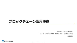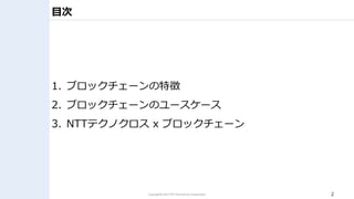 NTT TechnoCross Fair 2017 2017/09/21 ミニセミナー講演資料 わかるようでわからないブロックチェーンの概要や特徴と、どのような業務で活用できるのかをユースケースを交えてわかり易くご説明いたします。さらに、実際にシステムを運用する際に必要となる、ブロックチェーン内のデータを可視化、監査ログ出力機能を搭載した運用監視ツールをご紹介いたします。