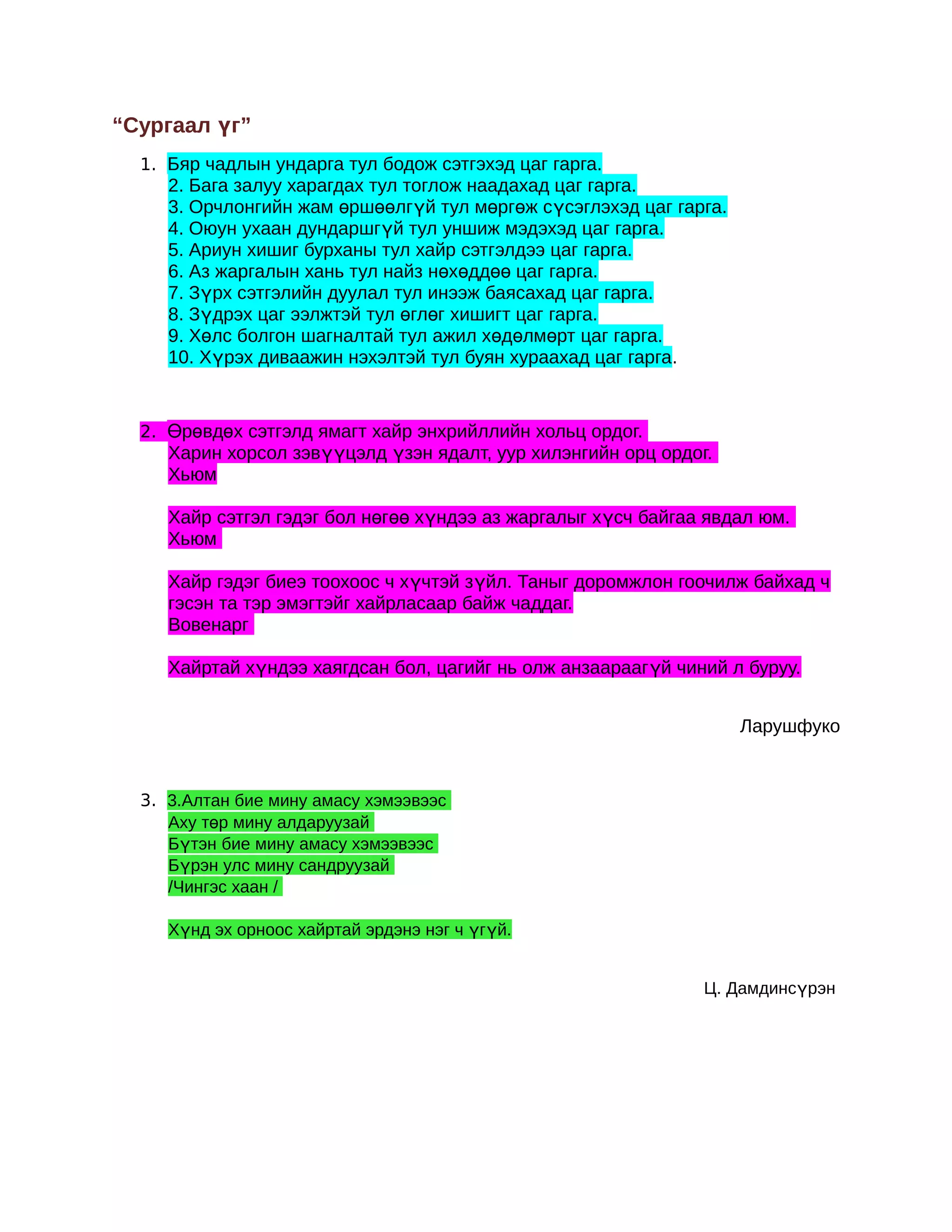 1. Бяр чадлын ундарга тул бодож сэтгэхэд цаг гарга. 2. Бага залуу харагдах тул тоглож наадахад цаг гарга. 3. Орчлонгийн жам өршөөлгүй тул мөргөж сүсэглэхэд цаг гарга. 4. Оюун ухаан дундаршгүй тул уншиж мэдэхэд цаг гарга. 5. Ариун хишиг бурханы тул хайр сэтгэлдээ цаг гарга. 6. Аз жаргалын хань тул найз нөхөддөө цаг гарга. 7. Зүрх сэтгэлийн дуулал тул инээж баясахад цаг гарга. 8. Зүдрэх цаг ээлжтэй тул өглөг хишигт цаг гарга. 9. Хөлс болгон шагналтай тул ажил хөдөлмөрт цаг гарга. 10. Хүрэх диваажин нэхэлтэй тул буян хураахад цаг гарга . 2. Өрөвдөх сэтгэлд ямагт хайр энхрийллийн хольц ордог. Харин хорсол зэвүүцэлд үзэн ядалт, уур хилэнгийн орц ордог. Хьюм Хайр сэтгэл гэдэг бол нөгөө хүндээ аз жаргалыг хүсч байгаа явдал юм. Хьюм Хайр гэдэг биеэ тоохоос ч хүчтэй зүйл. Таныг доромжлон гоочилж байхад ч гэсэн та тэр эмэгтэйг хайрласаар байж чаддаг. Вовенарг Хайртай хүндээ хаягдсан бол, цагийг нь олж анзаарааг үй чиний л буруу. Ларушфуко 3. 3.Алтан бие мину амасу хэмээвээс Аху төр мину алдаруузай Бүтэн бие мину амасу хэмээвээс Бүрэн улс мину сандруузай /Чингэс хаан / Хүнд эх орноос хайртай эрдэнэ нэг ч үгүй. Ц. Дамдинсүрэн