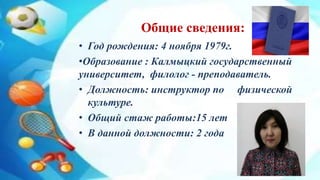 Документ содержит информацию о профессиональной деятельности инструктора по физической культуре, родившегося 4 ноября 1979 года, с 15-летним общим стажем работы, из которых 2 года в текущей должности. Основные темы самообразования включают физическое развитие детей, а в качестве повышения квалификации проводились курсы и семинары. Инструктор также проводит мастер-классы для воспитателей и родителей, организует спортивные праздники и описывает свои достижения и методические материалы.