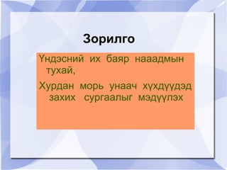 Хичээлийн зорилгоҮндэсний их баяр наадмаар ямар ямар уралдаан тэмцээн болдог вэ? Түүнийг юу юу гэж нэрлэдэг вэ? - 5.