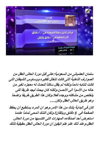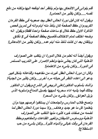 الوثيقة تناقش تجربة شخصية تتعلق بتعزيز التفكير والذاكرة من خلال دورة تدريبية تسلط الضوء على كيفية التغلب على العقبات الذهنية. يظهر الكاتب كيف تمكن من تحسين أدائه العقلي والتخلص من الوساوس من خلال الالتزام بالتدريب المكثف. كما يتطرق إلى أهمية فهم العوامل النفسية والعقلية في تحقيق النجاح.