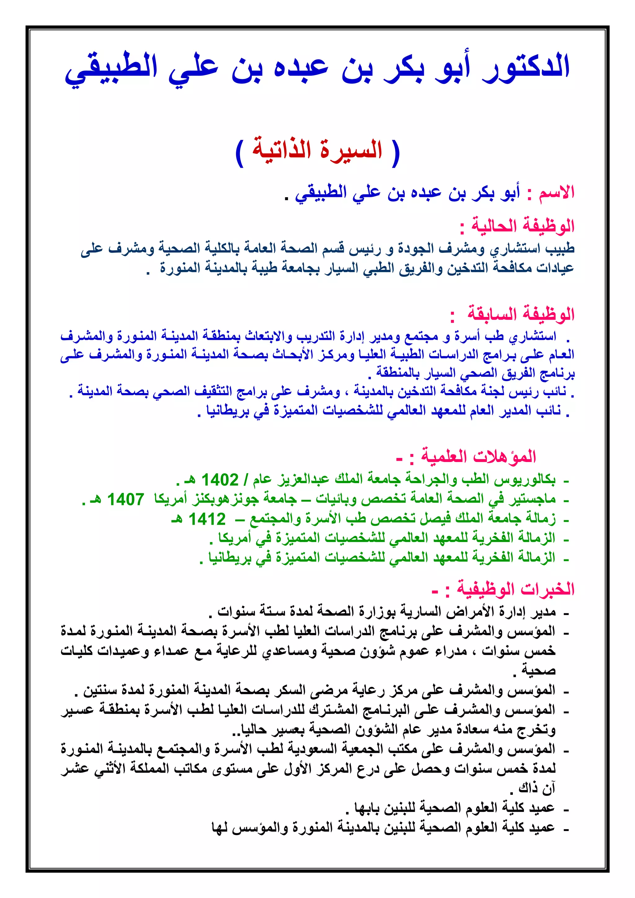 الدكتور أبو بكر بن عبده بن علً الطبٌقً هو طبيب استشاري ورئيس قسم الصحة العامة بجامعة طٌبة، لديه مؤهلات أكاديمية بارزة تشمل بكالوريوس في الطب والجراحة وماجستير في الصحة العامة. لديه خبرة واسعة في إدارة البرامج الصحية ومكافحة التدخين، بالإضافة إلى مشاركته في لجان علمية واستشارية محلية ودولية. حصل على عدة شهادات تقدير من مسؤولين مرموقين، بما في ذلك أصحاب السمو الملكي.