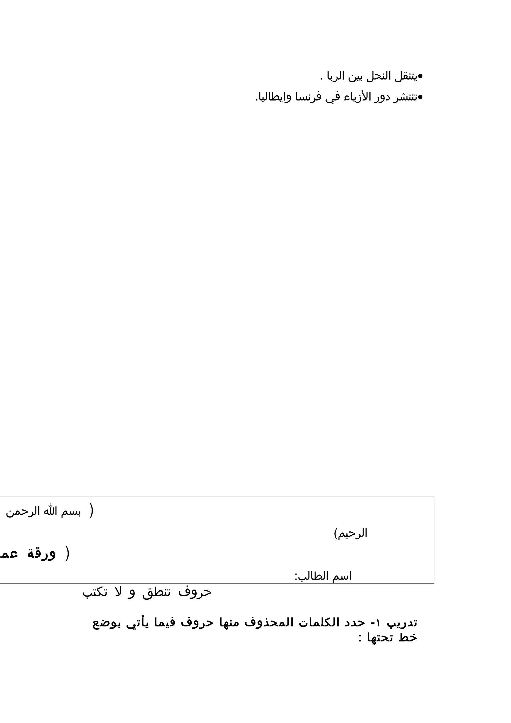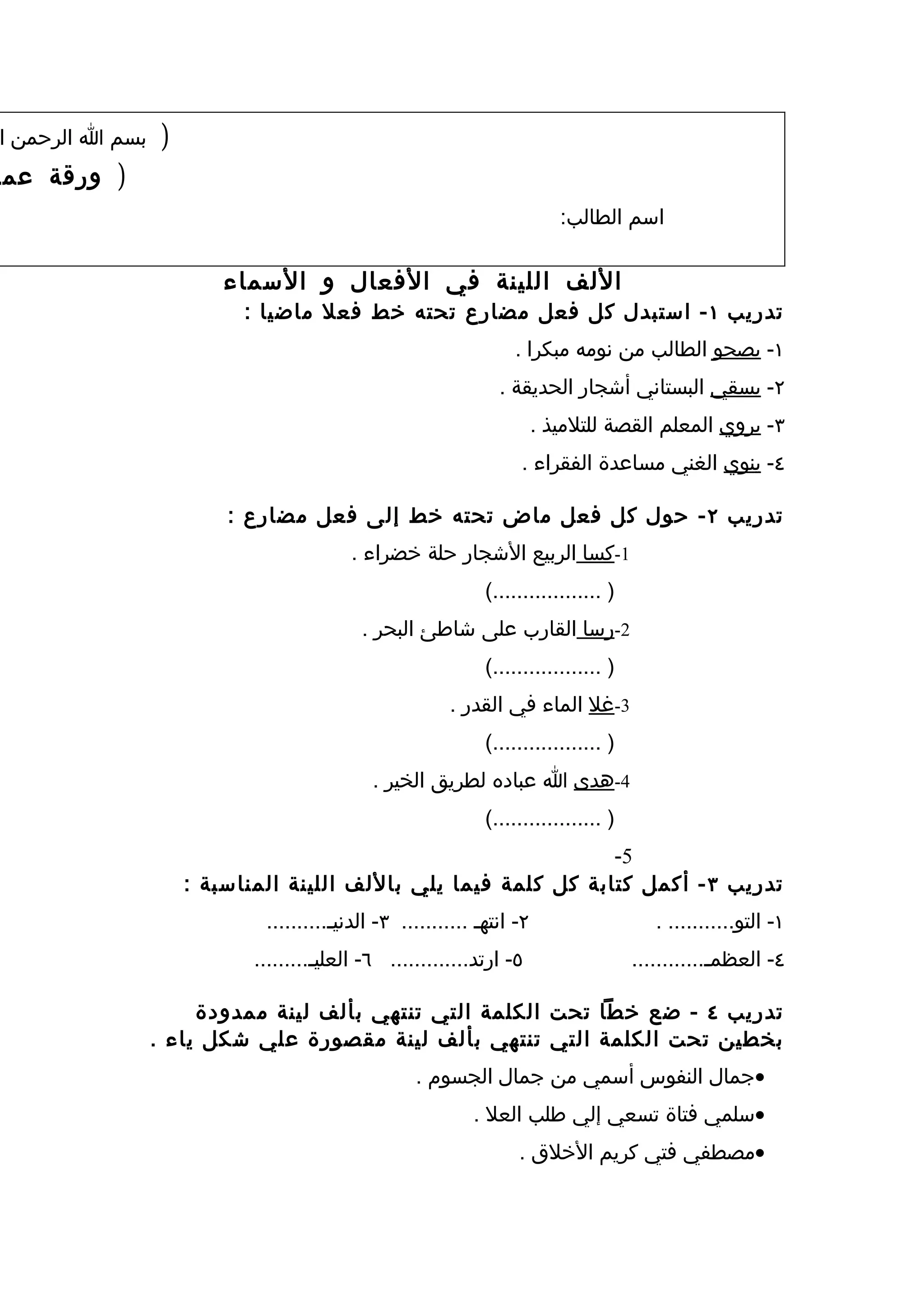 تتضمن الوثيقة ورقة عمل تعليمية تتعلق بتعليم الفعل المضارع والفعل الماضي، حيث تحتوي على تدريبات تستهدف تحويل الأفعال وممارسة القواعد اللغوية. بالإضافة إلى ذلك، تحتوي على تدريبات تتعلق بحروف محذوفة وألف لينة. كما تحتوي الوثيقة على أمثلة وحالات مختلفة لتعزيز الفهم اللغوي.