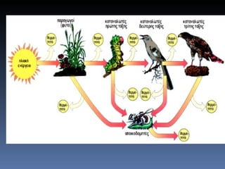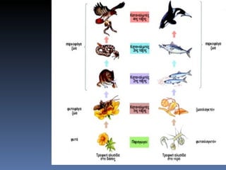 Τροφικές πυραμίδες Ημεταφορά ενέργειας ανάμεσα στους οργανισμούς μιας περιοχής απεικονίζεται πιο ολοκληρωμένα με τις τροφικές πυραμίδες. Απλοποιημένη απεικόνιση τροφικής πυραμίδας ολοκληρωμένα, με περισσότερες ενδείξεις για τα ποσά ενέργειας που μεταφέρονται, με τις τροφικές πυραμίδες. Στις τροφικές πυραμίδες οι οργανισμοί ομαδοποιούνται σε τροφικά επίπεδα και όσο πιο χαμηλά στην πυραμίδα βρίσκεται ένα τροφικό επίπεδο τόσο περισσότερη ενέργεια είναι διαθέσιμη για τους οργανισμούς που το συνιστούν.