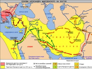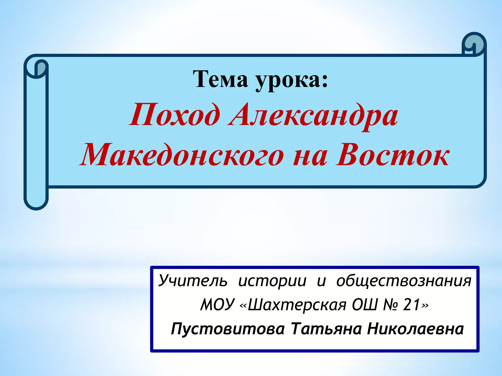 Документ содержит план урока по теме похода Александра Македонского на восток, подготовленный учителем истории. Он включает основные исторические факты, важные сражения, такие как битва при Иссе и Гавгамелах, а также причины завоеваний и влияние Александра на завоеванные территории. Также предусмотрены задания для групповой работы и обсуждения ключевых моментов его правления.