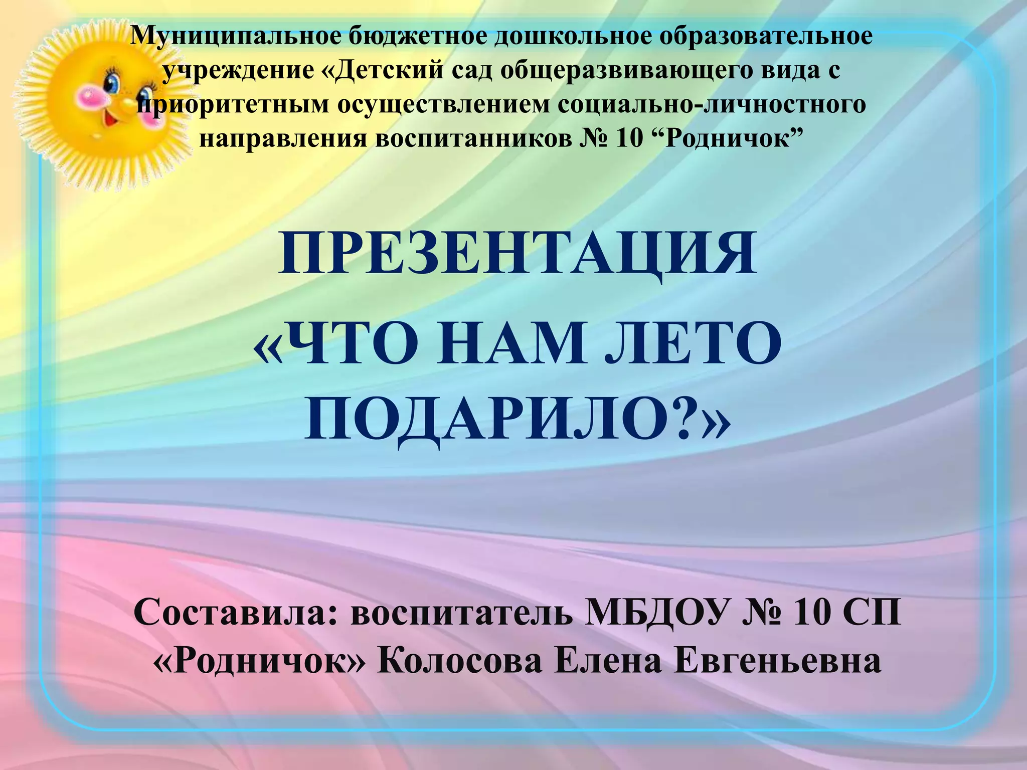 Документ представляет собой презентацию детского сада, в которой описаны задачи по укреплению здоровья детей и организации летнего отдыха. Основное внимание уделяется безопасности детей в летний период, вовлечению родителей в воспитательный процесс и разнообразным мероприятиям, проводимым летом. Приведены занятия, направленные на развитие творческих и физических способностей воспитанников.