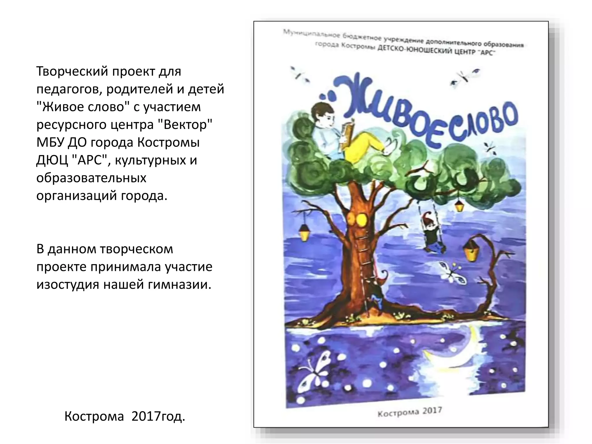 Творческий проект 'Живое слово' в Костроме охватывает участие педагогов, родителей и детей, включая изостудию гимназии. Проект включает иллюстрации к сказкам, созданные учащимися, и завершается презентацией книги с участием всех участников. Руководитель проекта, Галина Васильевна Лебедева, выразила пожелания дальнейших творческих успехов.