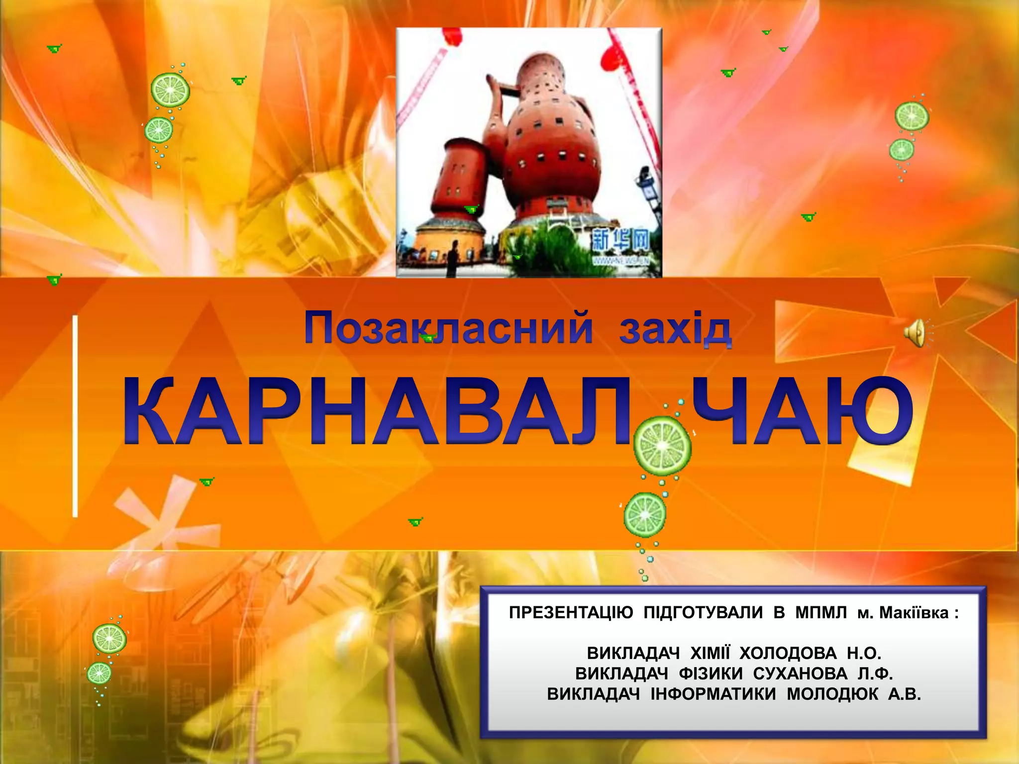 Позакласний західКАРНАВАЛ ЧАЮПРЕЗЕНТАЦІЮ ПІДГОТУВАЛИ В МПМЛ м. Макіївка :ВИКЛАДАЧ ХІМІЇ ХОЛОДОВА Н.О.ВИКЛАДАЧ ФІЗИКИ СУХАНОВА Л.Ф.ВИКЛАДАЧ ІНФОРМАТИКИ МОЛОДЮК А.В.