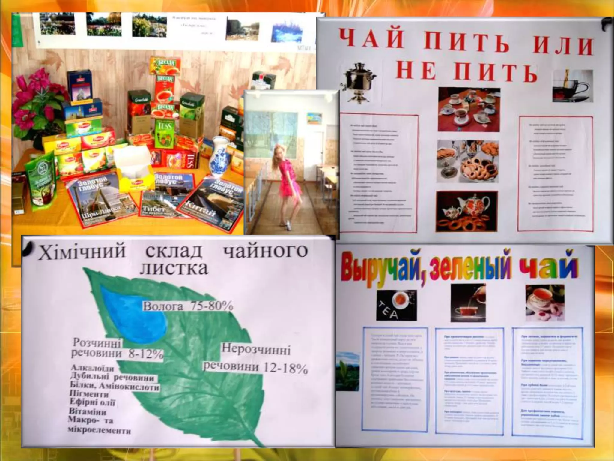 ВІТАМІНИ. ВПЛИВ НА ЗДОРОВ’Є ЛЮДИНИ : ВІТАМІНИ :розчинні - Р, В, РР, К, С.А, К, Е – розчинні в жирах (якщо з'їсти чайну заварку) А – каротин, що забезпечує нормальний стан слизистих оболонок носа, глотки, гортані, легенів, бронхів, сечостатевих органів і особливо важливий для збереження хорошого зору. В1 (тіамін), який сприяє нормальному функціонуванню нашій нервової системи і бере участь в регулюванні діяльності залоз внутрішньої секреції, – надниркових, статевих залоз, щитовидної залози. Важливий цей вітамін для хворих діабетом, виразкою шлунку, подагрою. В2 (рибофлавін) робить нашу шкіру красивою, еластичною, знижує її сухість, знімає лущення, а також полегшує лікування екземи. Важливий він для лікування важких захворювань печінки: цирозів, гепатитів, діабету. В15 (пантотенова кислота) перешкоджає розвитку шкірних захворювань (дерматитів) і важливий для нашого організму як каталізатор всіх процесів засвоєння речовин, що поступають.РР - нікотинова кислота, стійкий до високих температур і добре розчинний у воді. Отримання цього вітаміну з чаю особливо важливе для людей, що постійно харчуються очищеним рисом і кукурудзою, в яких вітамін РР майже повністю відсутній. У чаї його зміст виключно великий.С (аскорбінова кислота). У свіжому чайному листі його в 4 рази більше, ніж в соку лимона, проте при фабричній обробці частина його втрачається. Проте, в готовому чаї «аскорбінки» залишається немало, особливо в зеленому і жовтому чаї – раз в 10 більше, ніж в чорних.Р (або С2), який в комплексі з вітаміном С значно підсилює ефективність аскорбінової кислоти, сприяє її накопиченню і затриманню в організмі. Цей вітамін укріплює стінки кровоносних судин, запобігає внутрішнім крововиливу. За змістом вітаміну Р чай не має собі рівних на рослинному світі, особливо зелений чай. Випиваючи 3-4 чашки чаю хорошої фортеці, ми забезпечуємо свій організм необхідною добовою дозою цього важливого вітаміну. К- для функціювання серцевої м'язи.