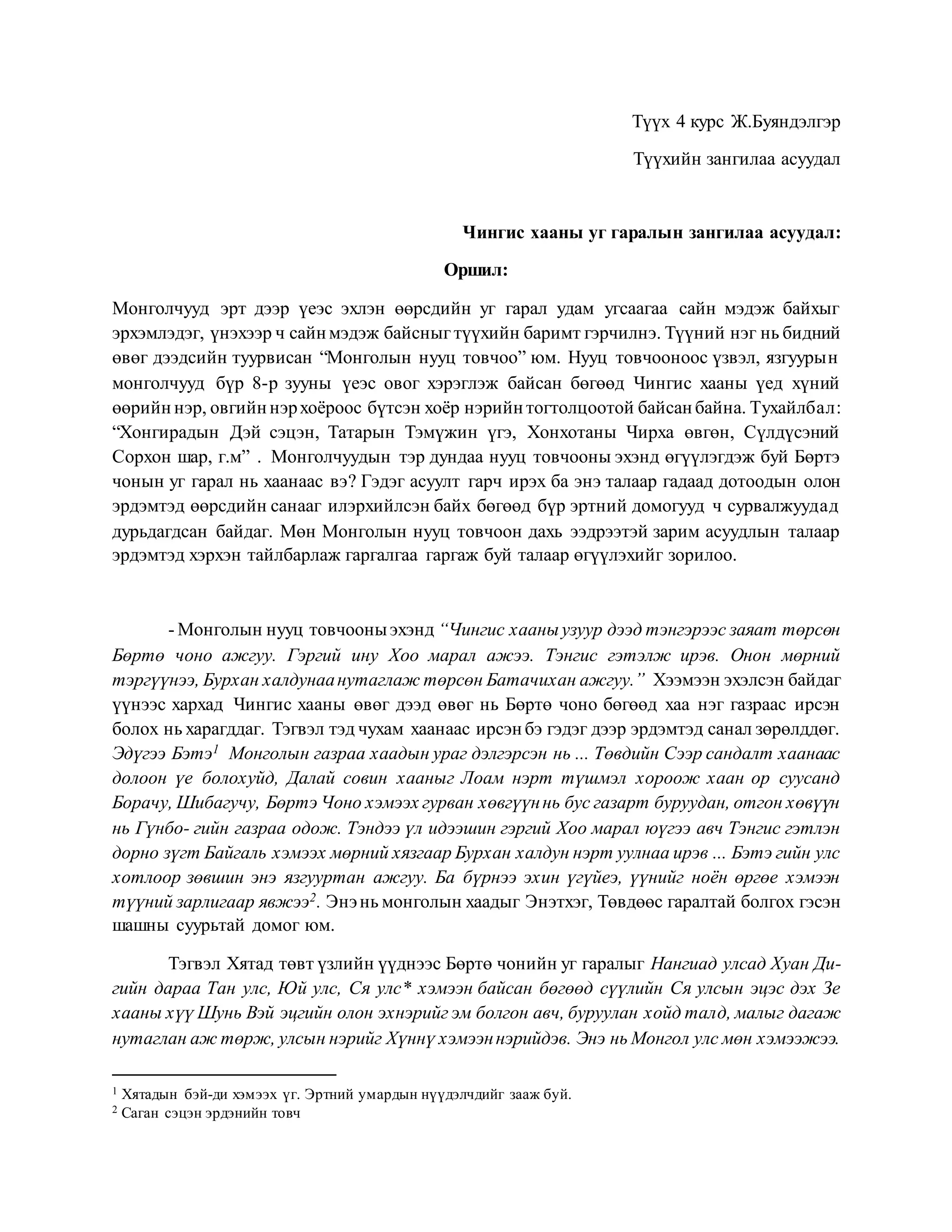 Ж.Буяндэлгэр Түүхийн зангилаа асуудал Чингис хааны уг гаралын зангилаа асуудал: Оршил: Монголчууд эрт дээр үеэс эхлэн өөрсдийн уг гарал удам угсаагаа сайн мэдэж байхыг эрхэмлэдэг, үнэхээр ч сайн мэдэж байсныг түүхийн баримт гэрчилнэ. Түүний нэг нь бидний өвөг дээдсийн туурвисан “Монголын нууц товчоо” юм. Нууц товчооноос үзвэл, язгуурын монголчууд бүр 8-р зууны үеэс овог хэрэглэж байсан бөгөөд Чингис хааны үед хүний өөрийн нэр, овгийн нэрхоёроос бүтсэн хоёр нэрийн тогтолцоотой байсан байна. Тухайлбал: “Хонгирадын Дэй сэцэн, Татарын Тэмүжин үгэ, Хонхотаны Чирха өвгөн, Сүлдүсэний Сорхон шар, г.м” . Монголчуудын тэр дундаа нууц товчооны эхэнд өгүүлэгдэж буй Бөртэ чонын уг гарал нь хаанаас вэ? Гэдэг асуулт гарч ирэх ба энэ талаар гадаад дотоодын олон эрдэмтэд өөрсдийн санааг илэрхийлсэн байх бөгөөд бүр эртний домогууд ч сурвалжуудад дурьдагдсан байдаг. Мөн Монголын нууц товчоон дахь ээдрээтэй зарим асуудлын талаар эрдэмтэд хэрхэн тайлбарлаж гаргалгаа гаргаж буй талаар өгүүлэхийг зорилоо. - Монголын нууц товчооныэхэнд “Чингис хааныузуур дээд тэнгэрээс заяат төрсөн Бөртө чоно ажгуу. Гэргий ину Хоо марал ажээ. Тэнгис гэтэлж ирэв. Онон мөрний тэргүүнээ, Бурхан халдунаанутаглаж төрсөн Батачихан ажгуу.” Хээмээн эхэлсэн байдаг үүнээс хархад Чингис хааны өвөг дээд өвөг нь Бөртө чоно бөгөөд хаа нэг газраас ирсэн болох нь харагддаг. Тэгвэл тэд чухам хаанаас ирсэн бэ гэдэг дээр эрдэмтэд санал зөрөлддөг. Эдүгээ Бэтэ1 Монголын газраа хаадын ураг дэлгэрсэн нь ... Төвдийн Сээр сандалт хаанаас долоон үе болохуйд, Далай совин хааныг Лоам нэрт түшмэл хороож хаан ор суусанд Борачу, Шибагучу, Бөртэ Чоно хэмээх гурван хөвгүүннь бус газарт буруудан, отгон хөвүүн нь Гүнбо- гийн газраа одож. Тэндээ үл идээшин гэргий Хоо марал юүгээ авч Тэнгис гэтлэн дорно зүгт Байгаль хэмээх мөрний хязгаар Бурхан халдун нэрт уулнаа ирэв ... Бэтэ гийн улс хотлоор зөвшин энэ язгууртан ажгуу. Ба бүрнээ эхин үгүйеэ, үүнийг ноён өргөе хэмээн түүний зарлигаар явжээ2. Энэнь монголын хаадыг Энэтхэг, Төвдөөс гаралтай болгох гэсэн шашны суурьтай домог юм. Тэгвэл Хятад төвт үзлийн үүднээс Бөртө чонийн уг гаралыг Нангиад улсад Хуан Ди- гийн дараа Тан улс, Юй улс, Ся улс* хэмээн байсан бөгөөд сүүлийн Ся улсын эцэс дэх Зе хааны хүү Шунь Вэй эцгийн олон эхнэрийг эм болгон авч, буруулан хойд талд, малыг дагаж нутаглан аж төрж, улсын нэрийг Хүннү хэмээннэрийдэв. Энэ нь Монгол улс мөн хэмээжээ. 1 Хятадын бэй-ди хэмээх үг. Эртний умардын нүүдэлчдийг зааж буй. 2 Саган сэцэн эрдэнийн товч