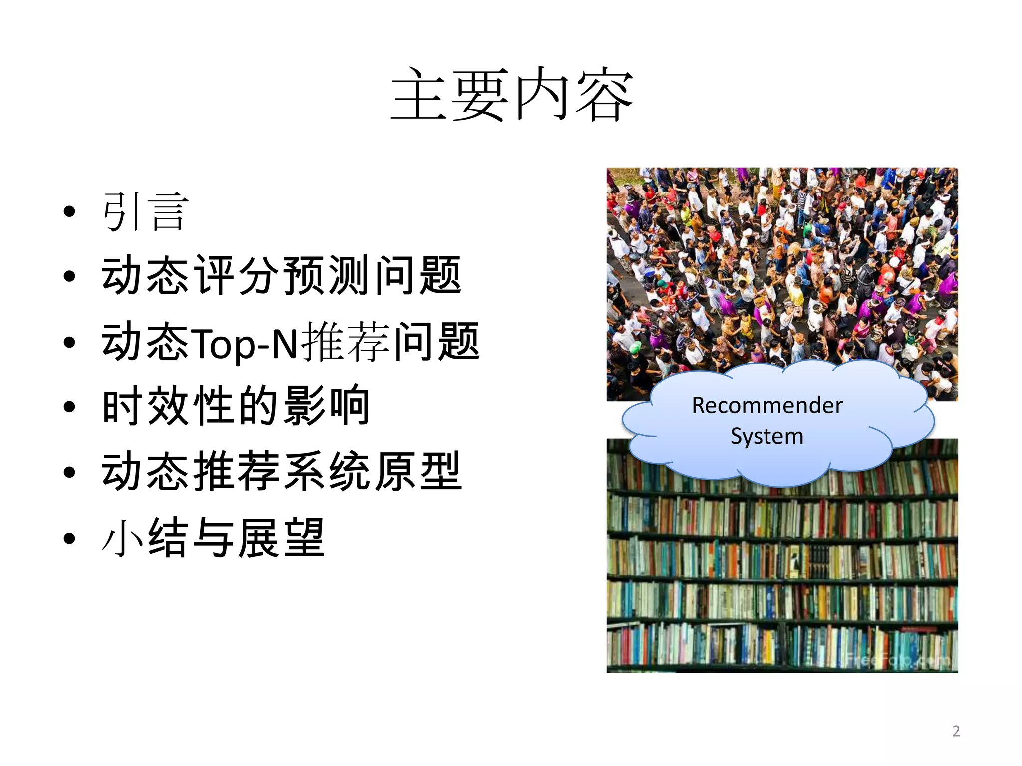 本文研究了动态推荐系统的关键技术,包括动态评分预测和动态top-n推荐问题,强调了时间效应对用户兴趣和物品流行度的影响。通过分析多个数据集,提出了动态用户兴趣模型,并探讨了长期与短期兴趣的融合。最后,展示了一个动态推荐系统原型,展望了未来在用户行为动态建模方面的研究方向。