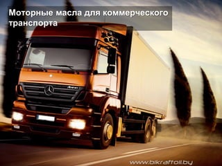 Документ представляет собой технический обзор масел для коммерческой техники, включая тенденции и спецификации моторных, трансмиссионных и гидравлических масел. Он также содержит информацию о структуре парка коммерческого транспорта в России и классификации масел по стандартам ACEA и API. В дополнение, рассматриваются свойства масел, их применение в высокооборотных дизельных двигателях и соблюдение экологических стандартов Euro.
