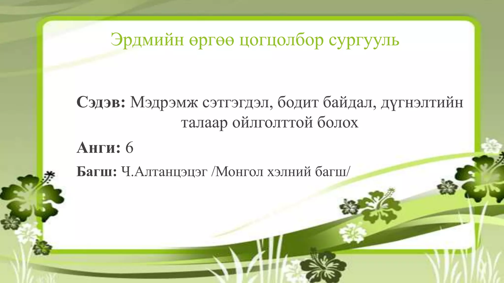 сургууль Сэдэв: Мэдрэмж сэтгэгдэл, бодит байдал, дүгнэлтийн талаар ойлголттой болох Анги: 6 Багш: Ч.Алтанцэцэг /Монгол хэлний багш/