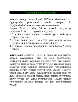 давтах гэх мэт. эзэмшилти йн өмнөх түвшин 1. Мэдлэ 2. Багшийн асуултыг ойлтон г агуулгын хувьд зөв ойлгох эзэмши боловч бусад ухагдахуунтай лтийн холбож, энгийн жишээг энгийн тайлбарлаж чаддаггүй түвшин 3. Нийлм 4. Хоёр буюу түүнээс олон эл ухагдахууныг агуулгын хувьд зөв түвшин тайлбарлах боловч холбоо нь салангид санааг тодорхойлж ярьдаг. 5. Учир 6. Суралцагч ухагдахуунуудыг шалтга тодорхой жишээ туршилтад ант үндэслэн тайлбарлах хариултын түвшин агуулга бүхэлдээ өөр хоорондоо уялдаа холбоотой баримтад түшиглэн баяжуулан тайлбарлана.