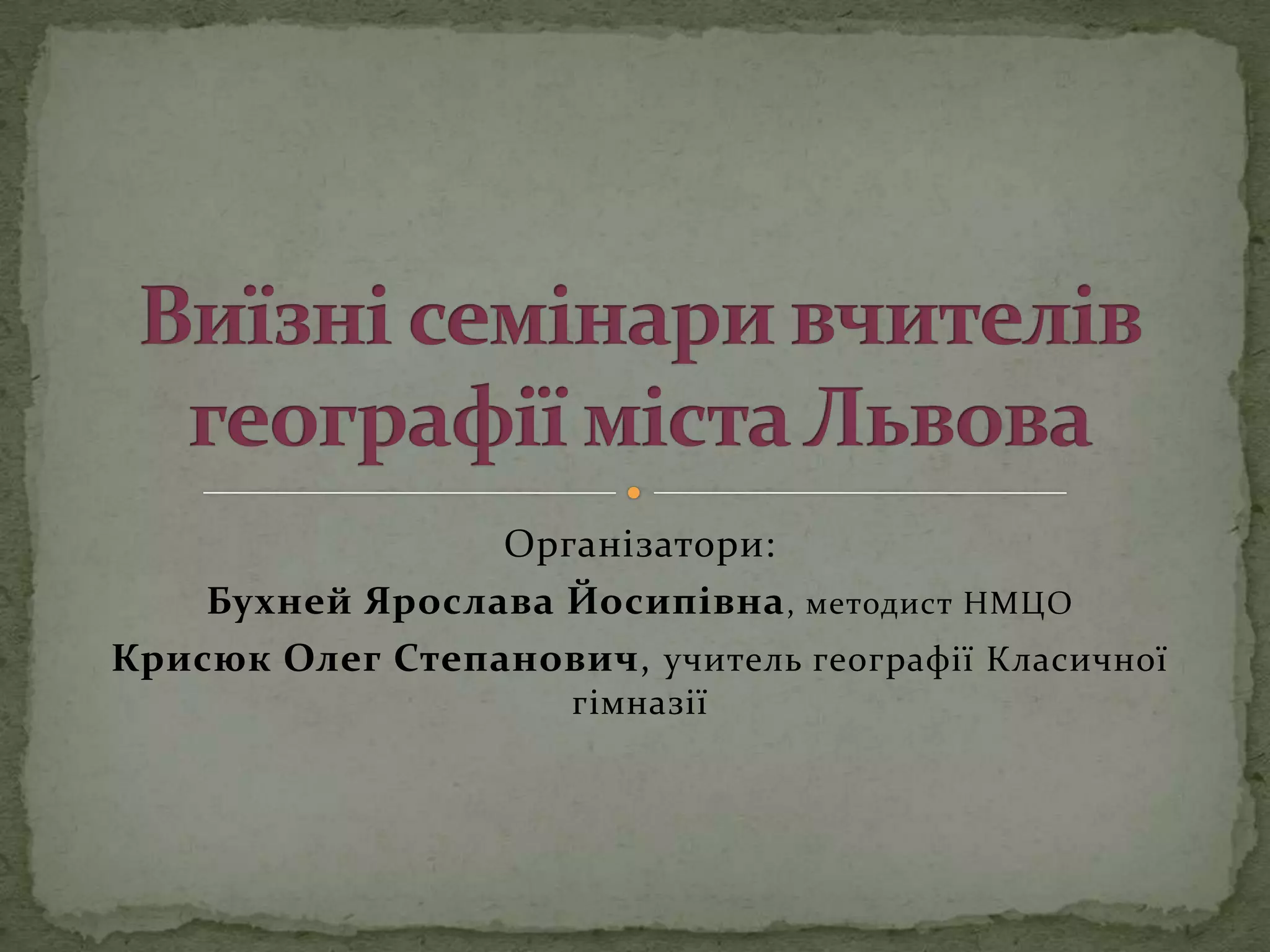 Організатори:Бухней Ярослава Йосипівна,методист НМЦОКрисюк Олег Степанович, учитель географії Класичної гімназіїВиїзні семінари вчителів географії міста Львова