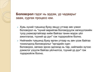 Боловсролынтодорхойлолтууд :Нийгмийнгишүүнийхувьдхүнийэзэмшсэнмэдлэг, шүтлэг,урлаг, ёссуртахуун, дадалзуршлыннэгдлийгсоёлгэхбөгөөдтүүнийгнийгмийнзахиалгаднийцүүлэннэгүеэснөгөөүеддамжуулаххэрэгслийгболовсролгэжойлгоно.Боловсролгэдгийндортүүхээрбийболсон, нийгмийнухамсартзохиххэмжээгээрсуусан, ямарнэгэнтөгсдүрдзориудчиглүүлэнбиехүнийоюунсанаа, биебялдар, нийгмийншинжийгтөлөвшүүлэхбүх л үйлявцыгойлгоно. - 6.