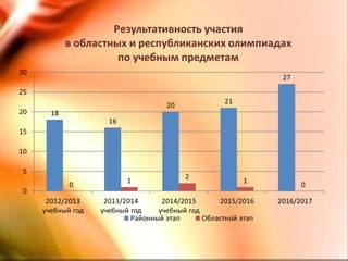 Документ содержит отчет о результативности работы Копаткевичской средней школы за учебный год 2016/2017, включая статистику по количеству учащихся и педагогов, а также информацию о профильном обучении. В нем представлены динамика успеваемости по предметам, результаты централизованного тестирования и планы на следующий учебный год, направленные на совершенствование качества образования. Также описываются разнообразные воспитательные и волонтерские мероприятия, направленные на развитие учащихся и вовлечение их родителей в образовательный процесс.