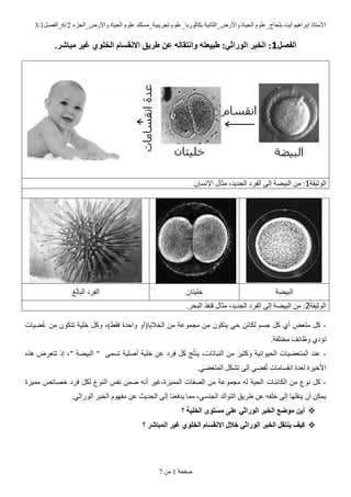 ذعش٠ث١ح_ِسٍه ٍَٛتىاٌٛس٠ا_ػ ٚاألسع_اٌصأ١ح اٌح١اج ٍَٛتٍحاض_ػ أ٠د ُ١٘إتشا األسرار2/6ً_اٌفظ1/3 طفحح1ِٓ7 انفصم1.يجبشر غُر ٌانخهى االَقسبو طرَق ٍع واَتقبنه طجُعته :ٍانىراث انخجر : اٌٛش١مح1اٌعذ٠ذ اٌفشد ٌٝإ اٌث١ؼح ِٓ :.ْاإلٔسا ِصاي ، اٌث١ؼحْخٍ١رااٌثاٌغ اٌفشد اٌٛش١مح2ِصاي ،اٌعذ٠ذ اٌفشد ٌٝإ اٌث١ؼح ِٓ :.اٌثحش لٕفز -ٟح ٌٓىائ ُظس ًو ٞأ ِرؼغ ًوؼ١اخُػ ِٓ ْٛذرى خٍ١ح ًٚو ،)فمؾ ٚاحذج ٚاٌخال٠ا(أ ِٓ ِعّٛػح ِٓ ْٛ٠رى .ِخرٍفح ٚظائف ٞذؤد -ٖ٘ز ذرؼشع إر ،" اٌث١ؼح " ّٝذس أطٍ١ح خٍ١ح ٓػ فشد ًو طُرٕ٠ ،إٌثاذاخ ِٓ ٚوص١ش اٌح١ٛأ١ح اٌّرؼؼ١اخ ػٕذ .ٟاٌّرؼؼ ًذشى ٌٝإ ٟفؼُذ أمساِاخ ٌؼذج األخ١شج -اٌىائٕاخ ِٓ ٔٛع ًوِّ١ضج خظائض فشد ًٌى إٌٛع ٔفس ّٓػ ٗٔأ اٌّّ١ضج،غ١ش اٌظفاخ ِٓ ِعّٛػح ٌٗ اٌح١ح .ٟاٌٛساش اٌخثش َِٛٙف ٓػ اٌحذ٠س ٌٝإ ٠ذفؼٕا ِّا ،ٟاٌعٕس اٌرٛاٌذ ؽش٠ك ٓػ ٗخٍف ٌٝإ ٠ٕمٍٙا ْأ ٓ٠ّى ؟ انخهُخ يستىي ًعه ٍانىراث انخجر يىضع ٍَأ انخهى االَقسبو خالل ٍانىراث انخجر َُتقم كُف؟ انًجبشر غُر ٌ