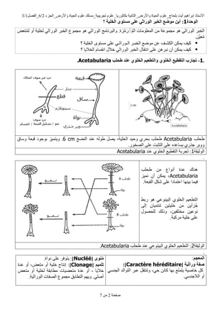 ذعش٠ث١ح_ِسٍه ٍَٛتىاٌٛس٠ا_ػ ٚاألسع_اٌصأ١ح اٌح١اج ٍَٛتٍحاض_ػ أ٠د ُ١٘إتشا األسرار2/6ً_اٌفظ1/3 طفحح2ِٓ7 انىحذح1:ٍَأ؟ انخهُخ يستىي ًعه ٍانىراث انخجر يىضع رؼغٌُّ ٚأ ٌخٍ١ح ٟاٌٛساش اٌخثش ِعّٛع ٛ٘ ٟاٌٛساش ٚاٌثشٔاِط .ضجََِّس ٌُُُُا اٌّؼٍِٛاخ ِٓ ِعّٛػح ٛ٘ ٟاٌٛساش اٌخثش .َّٓ١ؼُِ اٌىش ٓ٠ّى و١فـاٌخث ِٛػغ ٓػ فـٌا شـٛساشـ؟ اٌخٍ١ح ِٜٛسر ٍٝػ ٟ أ ٓ٠ّى و١ف؟ اٌخال٠ا َأمسا خالي ٟاٌٛساش اٌخثش أرماي ٍٝػ ٓ٘ٔثش ْ .1-طحهت عُذ ٌانخهى وانتطعُى ٌانخهى انتقطُع تجبرةAcetabularia. ؽحٍةAcetabulariaإٌؼط ػٕذ ٌٗٛؽ ً٠ظ ،اٌخٍ١ح ٚح١ذ ٞتحش ؽحٍة6 cmٚساق لثؼح تٛظٛد ٚ٠رّ١ض . .اٌظخٛس ٍٝػ اٌرصثد ٍٝػ ٖ٠ساػذ ٞظزس ٚٚتش اٌٛش١مح1ػٕذ ٍٞٛاٌخ اٌرمط١غ ذعشتح :Acetabularia . ؽحٍة ِٓ أٔٛاع ػذج ٕ٘ان Acetabulariaّٔ١ض ْأ ٓ٠ّى ، .اٌمثؼح ًشى ٍٝػ اػرّادا ت١ٕٙا ف١ّا ستؾ ٛ٘ ٟاٌث١ٕٛػ ٍٞٛاٌخ ُ١اٌرطؼ ٌٝإ ْذٕرّ١ا ٓ١خٍ١ر ِٓ ٓ٠ُضأظ ٌٍحظٛي ٚرٌه ،ٓ١ِخرٍف ٓ١ٔٛػ .ِشوثح خٍ١ح ٍٝػ اٌٛش١مح2:ؽحٍة ػٕذ ٟاٌث١ٕٛػ ٍٞٛاٌخ ُ١اٌرطؼAcetabularia. . انًعجى: وراثُخ صفخ[Caractère héréditaire]: ٟح ٓوائ تٙا ٠رّرغ خاط١ح ًو،ٟاٌعٕس اٌرٛاٌذ ػثش ًٚذٕرم .ٟاٌالظٕس ٚأ ُىيُي[Nucléé].ٔٛاج ٍٝػ ٠رٛفش : تهًُى[Clonage]ػذج ٚأ ،ِرؼغ ٚأ خٍ١ح إٔراض : ِ ػذج ٚأ ، خال٠اِرؼغ ٚأ ٌخٍ١ح ِطاتمح رؼؼ١اخ .اٌٛساش١ح اٌظفاخ ِعّٛع اٌرطاتك ُٙ٠ٚ .ٍٟأط
