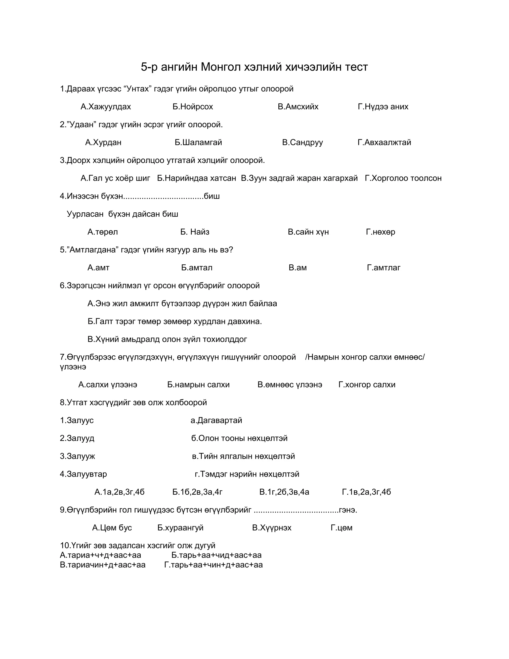 5-р ангийн Монголхэлний хичээлийн тест<br />1.Дараах үгсээс “Унтах” гэдэг үгийн ойролцоо утгыг олоорой<br /> А.Хажуулдах Б.Нойрсох В.Амсхийх Г.Нүдээ аних<br />2.”Удаан” гэдэг үгийн эсрэг үгийг олоорой.<br /> А.Хурдан Б.Шаламгай В.Сандруу Г.Авхаалжтай<br />3.Доорх хэлцийн ойролцоо утгатай хэлцийг олоорой.<br /> А.Гал ус хоёр шиг Б.Нарийндаа хатсан В.Зуун задгай жаран хагархай Г.Хорголоо тоолсон<br />4.Инээсэн бүхэн...................................биш<br /> Уурласан бүхэн дайсан биш <br /> А.төрөл Б. Найз В.сайн хүн Г.нөхөр<br />5.”Амтлагдана” гэдэг үгийн язгуур аль нь вэ? <br /> А.амт Б.амтал В.ам Г.амтлаг<br />6.Зэрэгцсэн нийлмэл үг орсон өгүүлбэрийг олоорой<br /> А.Энэ жил амжилт бүтээлээр дүүрэн жил байлаа<br /> Б.Галт тэрэг төмөр зөмөөр хурдлан давхина.<br /> В.Хүний амьдралд олон зүйл тохиолддог<br />7.Өгүүлбэрээс өгүүлэгдэхүүн, өгүүлэхүүн гишүүнийг олоорой /Намрын хонгор салхи өмнөөс/ үлээнэ<br /> А.салхи үлээнэ Б.намрын салхи В.өмнөөс үлээнэ Г.хонгор салхи<br />8.Утгат хэсгүүдийг зөв олж холбоорой<br />1.Залуус а.Дагавартай<br />2.Залууд б.Олон тооны нөхцөлтэй<br />3.Залууж в.Тийн ялгалын нөхцөлтэй<br />4.Залуувтар г.Тэмдэг нэрийн нөхцөлтэй<br /> А.1а,2в,3г,4б Б.1б,2в,3а,4г В.1г,2б,3в,4а Г.1в,2а,3г,4б<br />9.Өгүүлбэрийн гол гишүүдээс бүтсэн өгүүлбэрийг .....................................гэнэ.<br /> А.Цөм бус Б.хураангуй В.Хүүрнэх Г.цөм<br />10.Үгийг зөв задалсан хэсгийг олж дугуй А.тариа+ч+д+аас+аа Б.тарь+аа+чид+аас+аа В.тариачин+д+аас+аа Г.тарь+аа+чин+д+аас+аа<br />Асуулт12345678910ТүлхүүрбаВгаааБгГ<br /> Тест 2<br />1.”Өглөө” гэдэг үгийн эсрэг утгатай үгийг олоорой <br /> А.шөнө Б.орой В.бүрэнхий<br />2. Цэгийн оронд тохирох үгийг олж нөхөөрэй<br /> .......................... муут яван хатна<br />Сарьсан багваахай ........................ хатна<br /> А.сэтгэл, ууланд Б.санаа, наранд В.толгой,гадаа<br />3.Доорх үгийг зөв задалсан хэсгийг олоорой<br />А.хазаар+л+сан Б.хаз+аар+л+сан В.хазаарла+сан<br />4.Үгийн утгыг зөв холбоорой.<br />1.хөлдөнө а.намар<br />2.дэлгэрнэ б.хавар<br />3.соёолно в.өвөл<br />4.боловсорно г.зун<br />А.1в,2а,3в,4г Б.1г,2а,3б,4в В.1в,2г,3б,4а Г.1а,2г,3б,4в<br />5.Бүх үг нь язгуурт дагавар залгаж үүссэн хэсгийг олоорой<br /> А.малчин,сурлага,явлаа,шатрын Б.сурагч,гэрээс,ангийн,хүмүүжил<br /> В.эрдэмтэн,санаачил,туршлага,бичмэл Г.хавар,бичсэн,амжилт,салхины<br />6.Дараах 4хэсэг үгсийн аль нь төрөл үг вэ?<br />А.явдал, явц,явсан Б.гарц,гарал,гараа В.харах,харав,хараач Г.тарьлаа,таримал,тариа<br />7.Нийлмэл үгийн бүтцэд байгаа хоёр үг тэгш эрхтэйгээр нийлж бүтсэн үгийг.....................гэнэ.<br />А.нийлмэл үг Б.Угсарсан нийлмэл үг В.холбоо үг Г.Зэрэгцсэн нийлмэл үг<br />8.Бүгд УНҮ орсон хэсгийг олоорой.<br />А.Усан үзэм,баруун хойно,шийр алаг <br />Б.Унадаг дугуй,аз жаргал,ямаан арц<br />В.Зовлон жаргал,инээж баясах,таван салаа<br />9.Өгүүлэхүүн гишүүнтэй холбогдож хэнийг?,юуг?,ямрыг?,алийг? зэрэг асуултанд хариулагдах өгүүлбнрийн гол гишүүнийг ....................гэнэ.<br />А.Өгүүлэгдэхүүн Б.Шууд тусагдахуун В.Өгүүлэхүүн Г.байц<br />10.Хэлц үгийн утгыг зөв тайлбарласан хэсгийг олоорой<br />Амаа барих<br />А.Бага зэрэг муудалцах Б.Хэлэх ёсгүй зүйлийг хэлэх<br />В.Бүтэхгүй юм сэдэх Г.Өнгөрсөн хойно гэмших,харамсах<br />Асуулт12345678910түлхүүрББАВВБВАБГ<br />