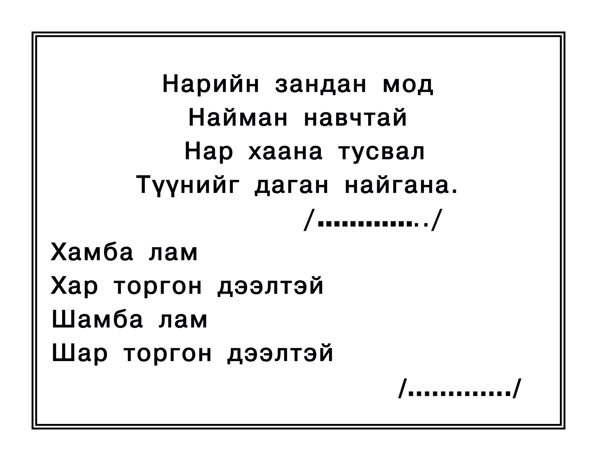 Íàéìàí íàâ÷òàé Íàð õààíà òóñâàë Ò¿¿íèéã äàãàí íàéãàíà. / …………../ Õàìáà ëàì Õàð òîðãîí äýýëòýé Øàìáà ëàì Øàð òîðãîí äýýëòýé /…………./