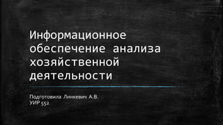 Документ рассматривает информационное обеспечение анализа хозяйственной деятельности, выделяя источники информации, их виды и требования к организации. Он делит источники на плановые, учетные и внеучетные, а также определяет важность качества и актуальности данных для анализа. Также подчеркиваются требования к объективности, единству и оперативности информации, что способствует повышению эффективности анализа.