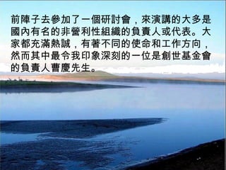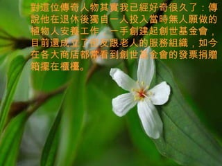 文档讲述了创世基金会负责人曹庆的传奇故事,他退休后投入照顾植物人和无家可归者的工作,强调了社会服务的重要性及其艰辛。他在演讲中分享了建立安养院和街友服务的目标,以及依靠小型捐款维持运作的经验,传递着无私奉献的理念。曹庆在85岁时寻找接班人,呼吁更多的人参与社会服务。
