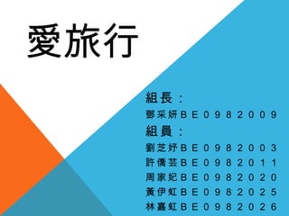 愛旅行組長: 鄧采妍be0982009組員: 劉芝妤be0982003許僑芸be0982011周家妃be0982020黃伊虹be0982025林嘉虹be0982026