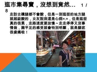逛市集尋寶,沒想到竟然… 1/8走訪古蹟腿都不會酸,但是一到逛街的地方腿就超級酸的,女友說我這是心病=.=,但是逛街真的很累,走路速度要放慢~走走停停又沒事情做,扁平足的感受就會特別明顯,就是腳底很痠痛啦!