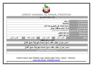 التقرير النهائي لمشروع مسجد جماعة سنابل الخير في باكستان يتضمن تفاصيل حول الموقع، تاريخ العقد، وتنفيذ المشروع. تم الانتهاء من جميع الأعمال المتعلقة بالمشروع، بما في ذلك الأساسات والجدران والسقف، في وقتها المحدد. يتضمن التقرير أيضًا معلومات الاتصال الخاصة بالمؤسسة.