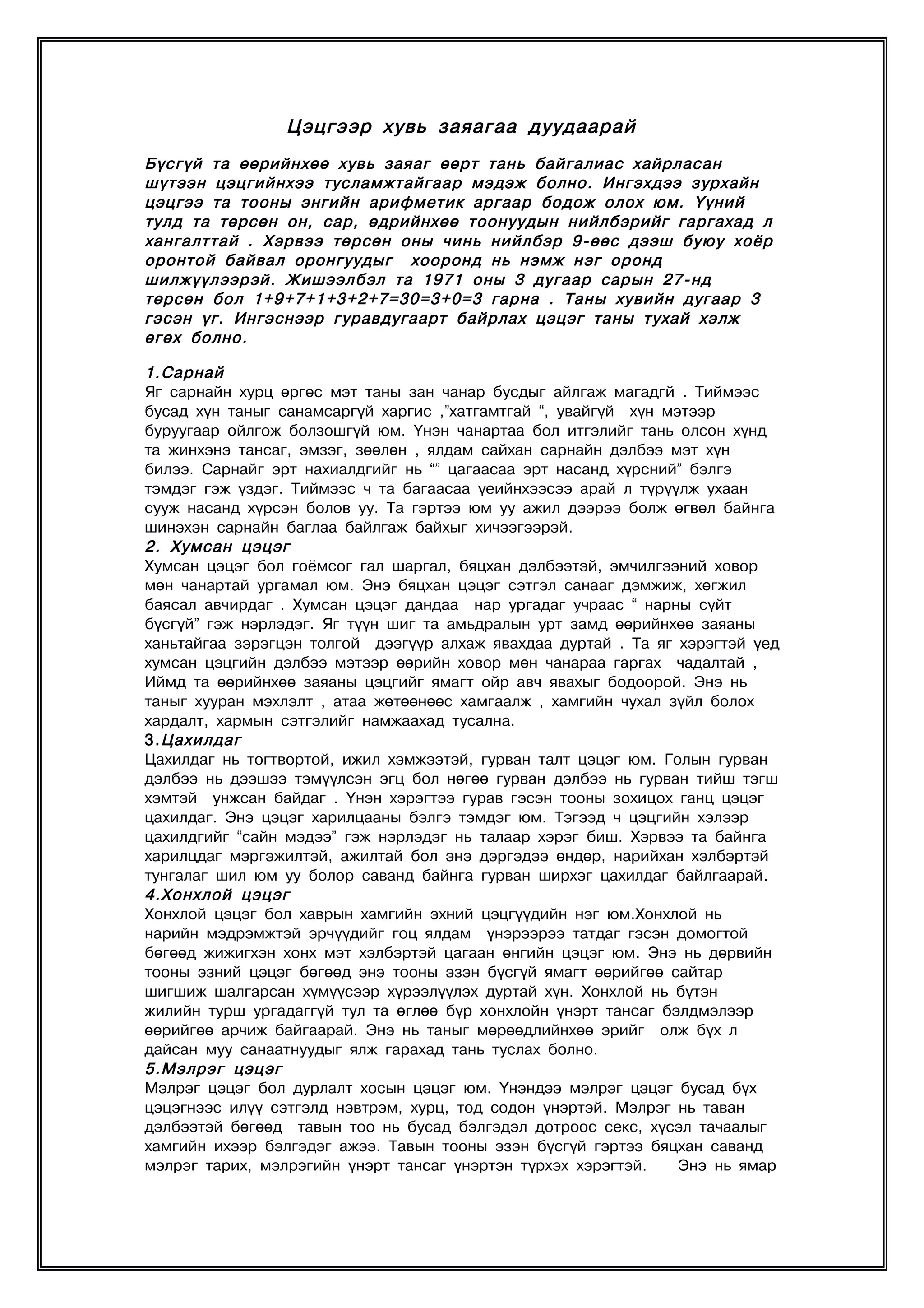 äóóäààðàé Á¿ñã¿é òà ººðèéíõºº õóâü çàÿàã ººðò òàíü áàéãàëèàñ õàéðëàñàí ø¿òýýí öýöãèéíõýý òóñëàìæòàéãààð ìýäýæ áîëíî. Èíãýõäýý çóðõàéí öýöãýý òà òîîíû ýíãèéí àðèôìåòèê àðãààð áîäîæ îëîõ þì. ¯¿íèé òóëä òà òºðñºí îí, ñàð, ºäðèéíõºº òîîíóóäûí íèéëáýðèéã ãàðãàõàä ë õàíãàëòòàé . Õýðâýý òºðñºí îíû ÷èíü íèéëáýð 9-ººñ äýýø áóþó õî¸ð îðîíòîé áàéâàë îðîíãóóäûã õîîðîíä íü íýìæ íýã îðîíä øèëæ¿¿ëýýðýé. Æèøýýëáýë òà 1971 îíû 3 äóãààð ñàðûí 27-íä òºðñºí áîë 1+9+7+1+3+2+7=30=3+0=3 ãàðíà . Òàíû õóâèéí äóãààð 3 ãýñýí ¿ã. Èíãýñíýýð ãóðàâäóãààðò áàéðëàõ öýöýã òàíû òóõàé õýëæ ºãºõ áîëíî. 1.Ñàðíàé ßã ñàðíàéí õóðö ºðãºñ ìýò òàíû çàí ÷àíàð áóñäûã àéëãàæ ìàãàäãé . Òèéìýýñ áóñàä õ¿í òàíûã ñàíàìñàðã¿é õàðãèñ ,”õàòãàìòãàé “, óâàéã¿é õ¿í ìýòýýð áóðóóãààð îéëãîæ áîëçîøã¿é þì. ¯íýí ÷àíàðòàà áîë èòãýëèéã òàíü îëñîí õ¿íä òà æèíõýíý òàíñàã, ýìçýã, 纺ëºí , ÿëäàì ñàéõàí ñàðíàéí äýëáýý ìýò õ¿í áèëýý. Ñàðíàéã ýðò íàõèàëäãèéã íü “” öàãààñàà ýðò íàñàíä õ¿ðñíèé” áýëãý òýìäýã ãýæ ¿çäýã. Òèéìýýñ ÷ òà áàãààñàà ¿åèéíõýýñýý àðàé ë ò¿ð¿¿ëæ óõààí ñóóæ íàñàíä õ¿ðñýí áîëîâ óó. Òà ãýðòýý þì óó àæèë äýýðýý áîëæ ºãâºë áàéíãà øèíýõýí ñàðíàéí áàãëàà áàéëãàæ áàéõûã õè÷ýýãýýðýé. 2. Õóìñàí öýöýã Õóìñàí öýöýã áîë ãî¸ìñîã ãàë øàðãàë, áÿöõàí äýëáýýòýé, ýì÷èëãýýíèé õîâîð ìºí ÷àíàðòàé óðãàìàë þì. Ýíý áÿöõàí öýöýã ñýòãýë ñàíààã äýìæèæ, õºãæèë áàÿñàë àâ÷èðäàã . Õóìñàí öýöýã äàíäàà íàð óðãàäàã ó÷ðààñ “ íàðíû ñ¿éò á¿ñã¿é” ãýæ íýðëýäýã. ßã ò¿¿í øèã òà àìüäðàëûí óðò çàìä ººðèéíõºº çàÿàíû õàíüòàéãàà çýðýãöýí òîëãîé äýýã¿¿ð àëõàæ ÿâàõäàà äóðòàé . Òà ÿã õýðýãòýé ¿åä õóìñàí öýöãèéí дэлбээ мэтээр өөрийн ховор мөн чанараа гаргах чадалтай , Иймд та өөрийнхөө заяаны цэцгийг ямагт ойр авч явахыг бодоорой. Энэ нь таныг хууран мэхлэлт , атаа жөтөөнөөс хамгаалж , хамгийн чухал зүйл болох хардалт, хармын сэтгэлийг намжаахад тусална. 3. Цахилдаг Цахилдаг нь тогтвортой, ижил хэмжээтэй, гурван талт цэцэг юм. Голын гурван дэлбээ нь дээшээ тэмүүлсэн эгц бол нөгөө гурван дэлбээ нь гурван тийш тэгш хэмтэй унжсан байдаг . Үнэн хэрэгтээ гурав гэсэн тооны зохицох ганц цэцэг цахилдаг. Энэ цэцэг харилцааны бэлгэ тэмдэг юм. Тэгээд ч цэцгийн хэлээр цахилдгийг “сайн мэдээ” гэж нэрлэдэг нь талаар хэрэг биш. Хэрвээ та байнга харилцдаг мэргэжилтэй, ажилтай бол энэ дэргэдээ өндөр, нарийхан хэлбэртэй тунгалаг шил юм уу болор саванд байнга гурван ширхэг цахилдаг байлгаарай. 4.Хонхлой цэцэг Хонхлой цэцэг бол хаврын хамгийн эхний цэцгүүдийн нэг юм.Хонхлой нь нарийн мэдрэмжтэй эрчүүдийг гоц ялдам үнэрээрээ татдаг гэсэн домогтой бөгөөд жижигхэн хонх мэт хэлбэртэй цагаан өнгийн цэцэг юм. Энэ нь дөрвийн тооны эзний цэцэг бөгөөд энэ тооны эзэн бүсгүй ямагт өөрийгөө сайтар шигшиж шалгарсан хүмүүсээр хүрээлүүлэх дуртай хүн. Хонхлой нь бүтэн жилийн турш ургадаггүй тул та өглөө бүр хонхлойн үнэрт тансаг бэлдмэлээр өөрийгөө арчиж байгаарай. Энэ нь таныг мөрөөдлийнхөө эрийг олж бүх л дайсан муу санаатнуудыг ялж гарахад тань туслах болно. 5.Мэлрэг цэцэг Мэлрэг цэцэг бол дурлалт хосын цэцэг юм. Үнэндээ мэлрэг цэцэг бусад бүх цэцэгнээс илүү сэтгэлд нэвтрэм, хурц, тод содон үнэртэй. Мэлрэг нь таван дэлбээтэй бөгөөд тавын тоо нь бусад бэлгэдэл дотроос секс, хүсэл тачаалыг хамгийн ихээр бэлгэдэг ажээ. Тавын тооны эзэн бүсгүй гэртээ бяцхан саванд мэлрэг тарих, мэлрэгийн үнэрт тансаг үнэртэн түрхэх хэрэгтэй. Энэ нь ямар