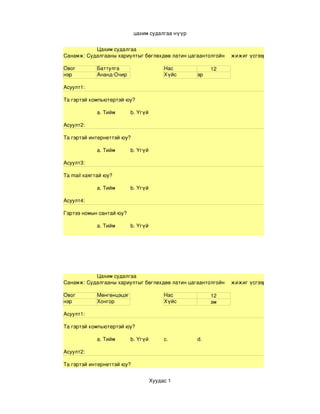 Санамж: Судалгааны хариултыг бөглөхдөө латин цагаантолгойн жижиг үсгээр бичнэ.