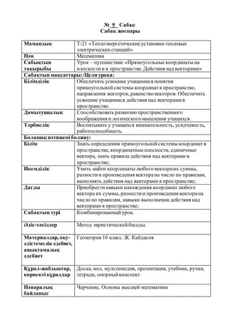 Документ представляет собой конспект урока по математике для студентов колледжа, фокусируясь на прямоугольных координатах в пространстве и действиях над векторами. Цели урока включают усвоение понятий координатной системы, направлений векторов и выполнения действий с векторами. Урок разделен на несколько этапов, включая проверку домашних заданий, изучение нового материала и закрепление знаний через практические задачи.