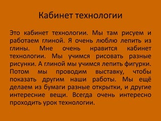 Кабинет технологии является любимым местом автора, где проходят занятия для 5.1 класса. В этом кабинете ученики учатся рисовать, лепить из глины и создавать различные поделки из бумаги. Уроки технологии всегда увлекательные, и в конце учащиеся проводят выставку своих работ.