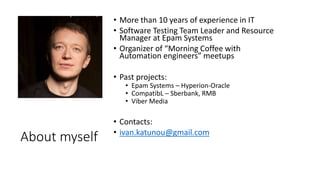 A Senior automation engineer should be able to work independently on modules from start to finish and ask the right questions. Key areas for a Senior to focus on include processes, estimations, the Test Pyramid, programming languages, test automation frameworks, improvements, build tools, libraries, coverage, databases, design patterns, best practices, testing types, CI/CD, reporting, metrics, communication, Git, BDD, code review, coding standards, team leadership, conflict management, and business communication. Resources provided include books, presentations, documentation, and Epam webinars to learn about these topics.