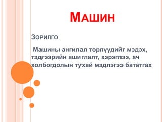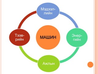 Хүлээгдэж буй үрдүнМашин гэж юуг хэлдэг вэ?Машиныг үндсэн зориулалтаар нь юу юу гэж ангилдаг вэ?Машины үндсэн эх үүсгэврүүд гэж юу юуг хэлэх вэ? - 4.