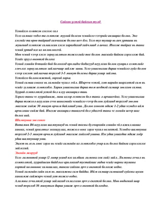 vсний уртад нэг их нөлөөлөхгvй. Мөн vсний vзvvр хэсэг зориулалтын тэжээлийг тос болон маскийг байнга хэрэглэж бай. Yсийг эрyyл өнгөтэй болгох Yсний хэвийн бvтцийг бий болгоход оролцдог бодисууд агуулсан болон хугарал гэмтлийг эмчлэх зориулалтын зайлагчаар зайлж занш. Yсээ угаасныхаа дараа vснийхээ хуйх болон vзvvр хэсэгт зайлагчаа тvрхээд 35 минут болсны дараа усаар зайлна. Yстэйгээ болгоомжтой, энрхий харьц Yсний самаа сонгох нь хамгийн чухал зvйл. Ширvvн vстэй, хэт нарийн ширхэгтэй сам нь vсийг зулгааж гэмтээдэг. Харин угаасныхаа дараа том шvдтэй самаар зөөлхөн самна. Хуурай гэмтэлтэй yстэй бол илyy анхаарал тавь Хэрвээ таны vс хуурайшиж, маш ихээр гэмтсэн бол таны л арчаагvйнх. Yсээ угаасныхаа дараа тэжээл агуулсан сvvн шингэнийг vснийхээ vзvvр болон хуйханд тvрхээд зөөлөн массаж хийж 30 минут орчим байлгаад угаа. Долоо хоногт ядаж 12 удаа vсэндээ ийм арчилгааг хийж бай. Ингэж анхаарал тавихгvй бол удахгvй таны vс хогийн шvvр шиг болох вий. Шампуниа зөв сонго Витамин В6 агуулсан шампуниуд нь vсний тосны булчирхайн хэвийн vйл ажиллагааг хангах, vсний ургалтыг зохицуулах, тэжээл өгөх зэрэг чухал нєлєєтэй. Yсэндээ шампуниа тvрхээд 23 минут орчим хуйханд массаж хийгээд угаана. Нэг удаа угаахдаа ядаж хоёр удаа шампуниар угаа. Эцэст нь гель хөөс зэрэг нь vсийг хамгийн их гэмтээдэг учир аль болох байнга хэрэглэхээс зайлсхий. Энгийн жорууд Yсээ лимонтой усаар (2 литр усанд нэг халбага лимоны сок хий) зайл. Лимоны хvчил нь гэмтэлтэй, хуурайшсан байдлыг арилгахад тустайгаас гадна vсийг нарны туяаны хортой нөлөөнөөс хамгаалах, тансаг сайхан эрvvл өнгөтэй болгож өгдөг. Yсний хамгийн сайн сам нь массажны сам байдаг. Ийм самаар самнахад хуйхны цусан хангамж сайжирч vсний угт тэжээ өгдөг. Алимны хvчилтэй усаар зайлахад гялалзсан эрvvл єнгєтэй болно. Мөн өндөгний шар vсэнд тvрхээд 30 минутын дараа угааж эрvvл өнгөтэй болгодог.