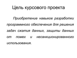 Курсовой проект посвящён теории кодирования и криптографии, с акцентом на разработку программного обеспечения для решения задач сжатия и защиты данных. В проекте рассматриваются современные методы сжатия, шифрования и их реализация, а также требования к оформлению документации. Кроме того, проект включает выбор методов для защиты данных, сжатия и описание примеров программной реализации.