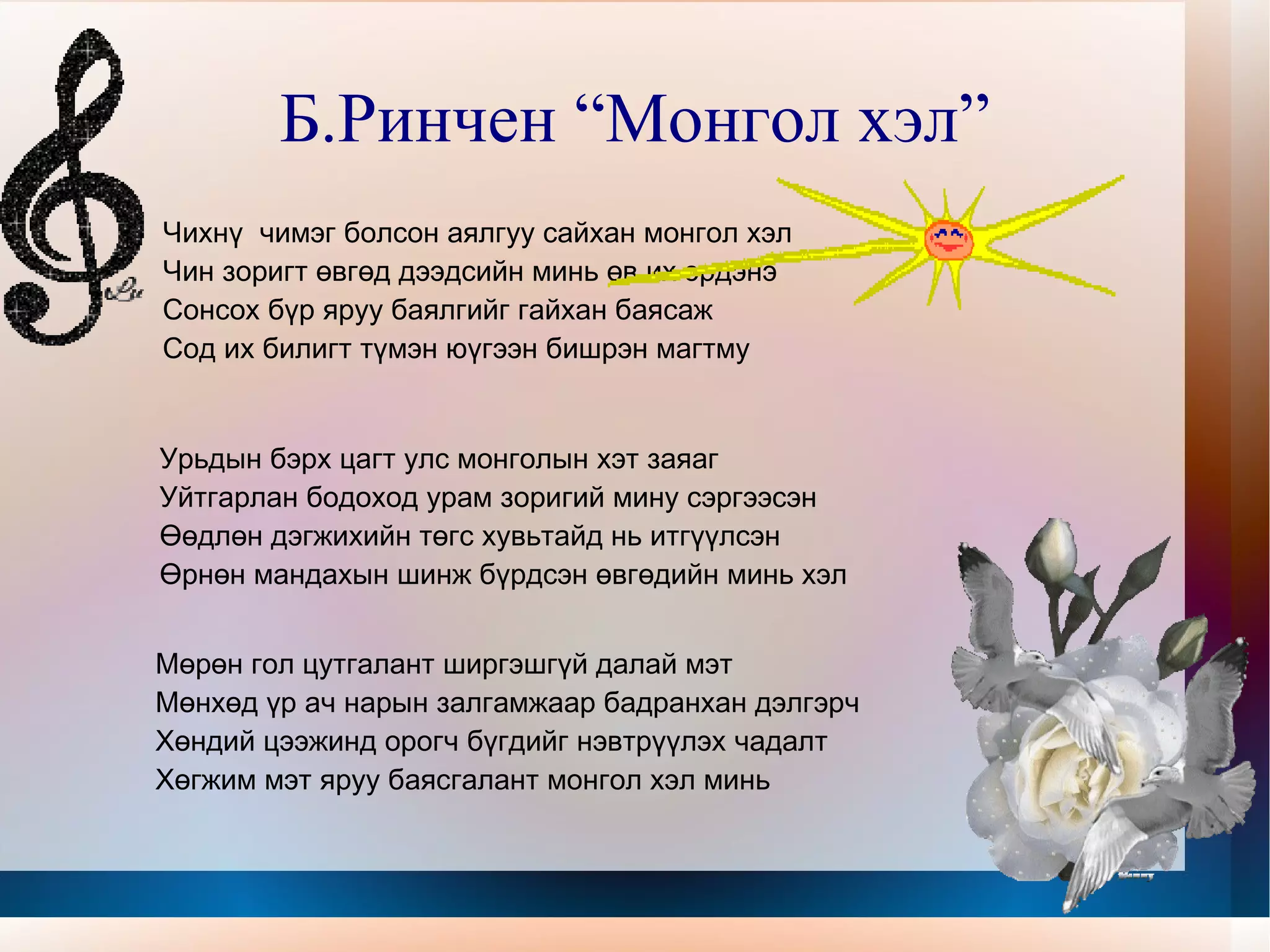Б.Ринчен “Монгол хэл”Чихнү чимэг болсон аялгуу сайхан монгол хэл Чин зоригт өвгөд дээдсийн минь өв их эрдэнэ Сонсох бүр яруу баялгийг гайхан баясаж Сод их билигт түмэн юүгээн бишрэн магтму Урьдын бэрх цагт улс монголын хэт заяаг Уйтгарлан бодоход урам зоригий мину сэргээсэн Өөдлөн дэгжихийн төгс хувьтайд нь итгүүлсэн Өрнөн мандахын шинж бүрдсэн өвгөдийн минь хэл Мөрөн гол цутгалант ширгэшгүй далай мэт Мөнхөд үр ач нарын залгамжаар бадранхан дэлгэрч Хөндий цээжинд орогч бүгдийг нэвтрүүлэх чадалт Хөгжим мэт яруу баясгалант монгол хэл минь - 12.