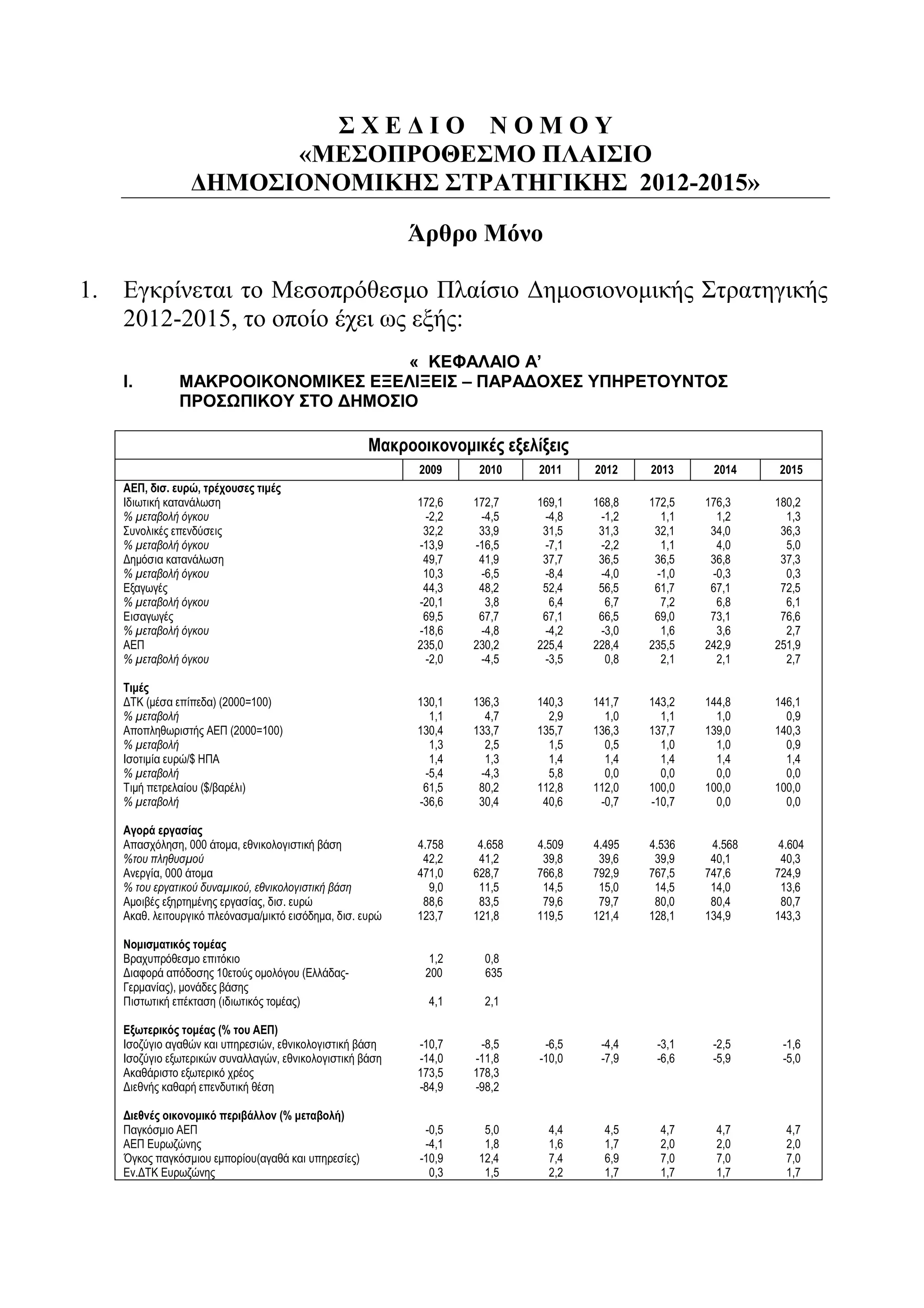 «ΜΕΣΟΠΡΟΘΕΣΜΟ ΠΛΑΙΣΙΟ ∆ΗΜΟΣΙΟΝΟΜΙΚΗΣ ΣΤΡΑΤΗΓΙΚΗΣ 2012-2015» Άρθρο Μόνο 1. Εγκρίνεται το Μεσοπρόθεσµο Πλαίσιο ∆ηµοσιονοµικής Στρατηγικής 2012-2015, το οποίο έχει ως εξής: « ΚΕΦΑΛΑΙΟ Α’ Ι. ΜΑΚΡΟΟΙΚΟΝΟΜΙΚΕΣ ΕΞΕΛΙΞΕΙΣ – ΠΑΡΑ∆ΟΧΕΣ ΥΠΗΡΕΤΟΥΝΤΟΣ ΠΡΟΣ ΠΙΚΟΥ ΣΤΟ ∆ΗΜΟΣΙΟ Μακροοικονοµικές εξελίξεις 2009 2010 2011 2012 2013 2014 2015 ΑΕΠ, δισ. ευρώ, τρέχουσες τιµές Ιδιωτική κατανάλωση 172,6 172,7 169,1 168,8 172,5 176,3 180,2 % µεταβολή όγκου -2,2 -4,5 -4,8 -1,2 1,1 1,2 1,3 Συνολικές επενδύσεις 32,2 33,9 31,5 31,3 32,1 34,0 36,3 % µεταβολή όγκου -13,9 -16,5 -7,1 -2,2 1,1 4,0 5,0 ∆ηµόσια κατανάλωση 49,7 41,9 37,7 36,5 36,5 36,8 37,3 % µεταβολή όγκου 10,3 -6,5 -8,4 -4,0 -1,0 -0,3 0,3 Εξαγωγές 44,3 48,2 52,4 56,5 61,7 67,1 72,5 % µεταβολή όγκου -20,1 3,8 6,4 6,7 7,2 6,8 6,1 Εισαγωγές 69,5 67,7 67,1 66,5 69,0 73,1 76,6 % µεταβολή όγκου -18,6 -4,8 -4,2 -3,0 1,6 3,6 2,7 ΑΕΠ 235,0 230,2 225,4 228,4 235,5 242,9 251,9 % µεταβολή όγκου -2,0 -4,5 -3,5 0,8 2,1 2,1 2,7 Τιµές ∆ΤΚ (µέσα επίπεδα) (2000=100) 130,1 136,3 140,3 141,7 143,2 144,8 146,1 % µεταβολή 1,1 4,7 2,9 1,0 1,1 1,0 0,9 Αποπληθωριστής ΑΕΠ (2000=100) 130,4 133,7 135,7 136,3 137,7 139,0 140,3 % µεταβολή 1,3 2,5 1,5 0,5 1,0 1,0 0,9 Ισοτιµία ευρώ/$ ΗΠΑ 1,4 1,3 1,4 1,4 1,4 1,4 1,4 % µεταβολή -5,4 -4,3 5,8 0,0 0,0 0,0 0,0 Τιµή πετρελαίου ($/βαρέλι) 61,5 80,2 112,8 112,0 100,0 100,0 100,0 % µεταβολή -36,6 30,4 40,6 -0,7 -10,7 0,0 0,0 Αγορά εργασίας Απασχόληση, 000 άτοµα, εθνικολογιστική βάση 4.758 4.658 4.509 4.495 4.536 4.568 4.604 %του πληθυσµού 42,2 41,2 39,8 39,6 39,9 40,1 40,3 Ανεργία, 000 άτοµα 471,0 628,7 766,8 792,9 767,5 747,6 724,9 % του εργατικού δυναµικού, εθνικολογιστική βάση 9,0 11,5 14,5 15,0 14,5 14,0 13,6 Αµοιβές εξηρτηµένης εργασίας, δισ. ευρώ 88,6 83,5 79,6 79,7 80,0 80,4 80,7 Ακαθ. λειτουργικό πλεόνασµα/µικτό εισόδηµα, δισ. ευρώ 123,7 121,8 119,5 121,4 128,1 134,9 143,3 Νοµισµατικός τοµέας Βραχυπρόθεσµο επιτόκιο 1,2 0,8 ∆ιαφορά απόδοσης 10ετούς οµολόγου (Ελλάδας- 200 635 Γερµανίας), µονάδες βάσης Πιστωτική επέκταση (ιδιωτικός τοµέας) 4,1 2,1 Εξωτερικός τοµέας (% του ΑΕΠ) Ισοζύγιο αγαθών και υπηρεσιών, εθνικολογιστική βάση -10,7 -8,5 -6,5 -4,4 -3,1 -2,5 -1,6 Ισοζύγιο εξωτερικών συναλλαγών, εθνικολογιστική βάση -14,0 -11,8 -10,0 -7,9 -6,6 -5,9 -5,0 Ακαθάριστο εξωτερικό χρέος 173,5 178,3 ∆ιεθνής καθαρή επενδυτική θέση -84,9 -98,2 ∆ιεθνές οικονοµικό περιβάλλον (% µεταβολή) Παγκόσµιο ΑΕΠ -0,5 5,0 4,4 4,5 4,7 4,7 4,7 ΑΕΠ Ευρωζώνης -4,1 1,8 1,6 1,7 2,0 2,0 2,0 Όγκος παγκόσµιου εµπορίου(αγαθά και υπηρεσίες) -10,9 12,4 7,4 6,9 7,0 7,0 7,0 Εν.∆ΤΚ Ευρωζώνης 0,3 1,5 2,2 1,7 1,7 1,7 1,7